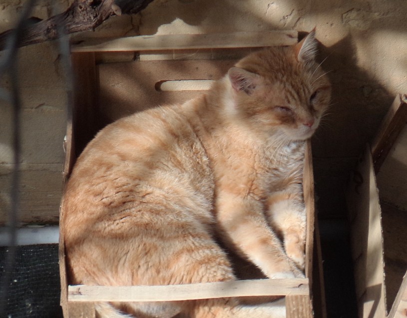 Recently Saturday has become less feral and discovered quite an endearing miaow, the size of which is a direct contradiction to his physical size. He has become more comfortable in proximity to the humans who feed him – for a feral gentleman, his garden manners are pleasing to behold. His enthusiasm for food means that he has started coming to the food rather than waiting for it to come to him (saving two or three precious seconds’ eating time). Having polished his own bowl, he sits patiently, a queue of one, staring wistfully at The Cat as she eats, in the hope that she will abandon her special food before the dish is empty, so he can move in. He relaxes in one of the wooden fruit boxes, carefully chosen by him to be just-too-small-in-every-direction.