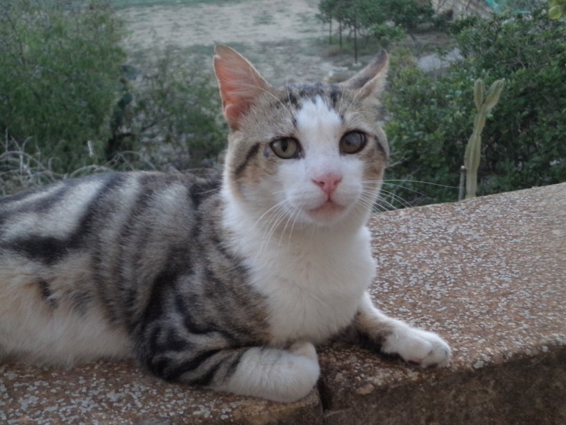 Pikabu became a regular visitor. A regular visitor with a hearty appetite, as it turned out, rather like some of the other visiting ferals, but on an altogether bigger scale. He seemed used to having humans around, which made us wonder whether he was stray rather than feral. He started to solicit contact (as well as ever-increasing quantities of food) and it was noticed that one of his eyes was clouded and he could in fact only see from the other. This explained Pikabu’s peekaboo nature and head-bobbing.