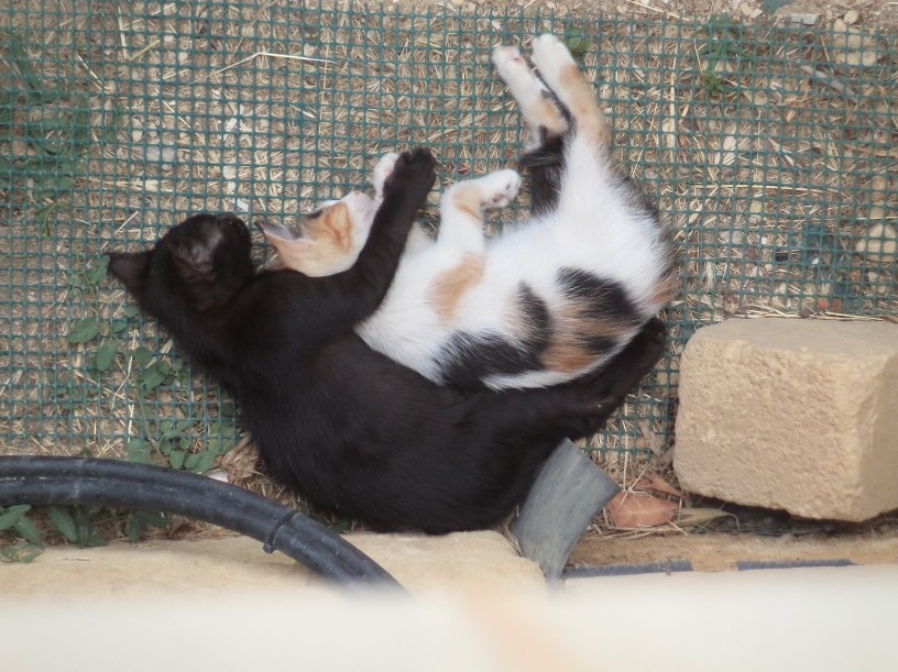 Unlike the Furries the year previously, Flora Fourpaws and Furrileesa Fourpaws were not born in the garden. Rather The Cat chose somewhere out in the fields to raise her litter for the first few weeks of their lives. There was an inevitability that, all being well, she would bring the kittens back to the garden for weaning and, one evening around six weeks after their birth, she did exactly that, carrying them carefully but briskly one at a time from their nest in the fields, scaling walls with them in her mouth and finally depositing them inside one of the pods provided to give shelter in colder weather. She proudly showed them off to the humans; Flora was a calico, three colours (like her tortoiseshell mamma) but with much more white, rather like The Cat’s daughter Ratchet, born a few years previously. Furrileesa was black with a tiny white dot at his throat; the humans guessed Longtail was his father.