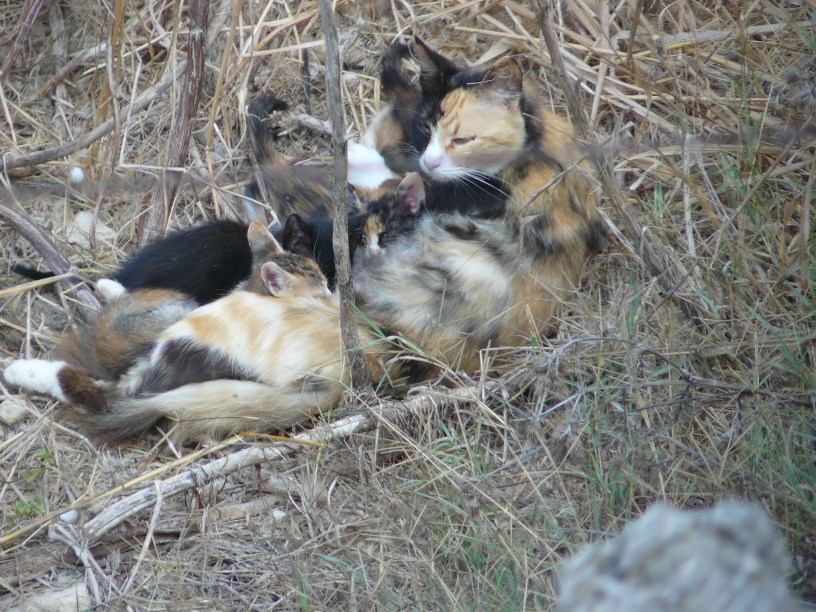 The Cat’s four little charges certainly kept her on her toes. They had the field with its undergrowth to play in, the prickly pear to climb in and nap under, and, most importantly, each other. Their mother would nap in the drive, just on the other side of the wall from her family, within earshot but out of sight. That way, she could be back in the field within seconds if needed, but the kittens got used to spending time on their own.