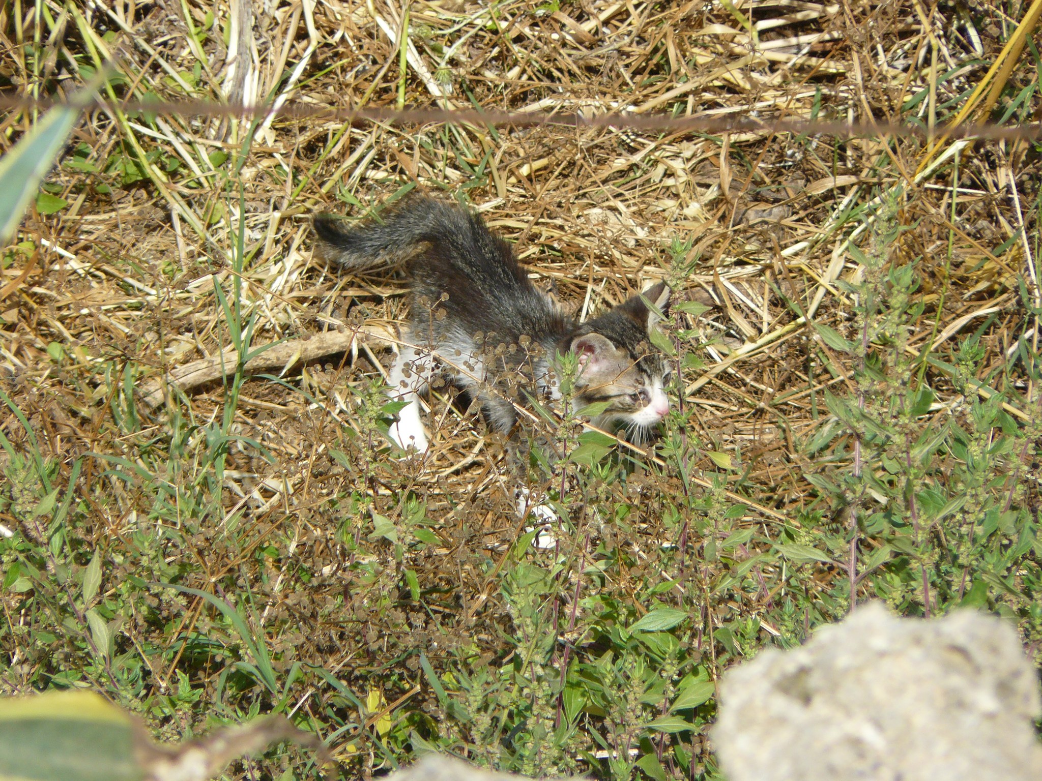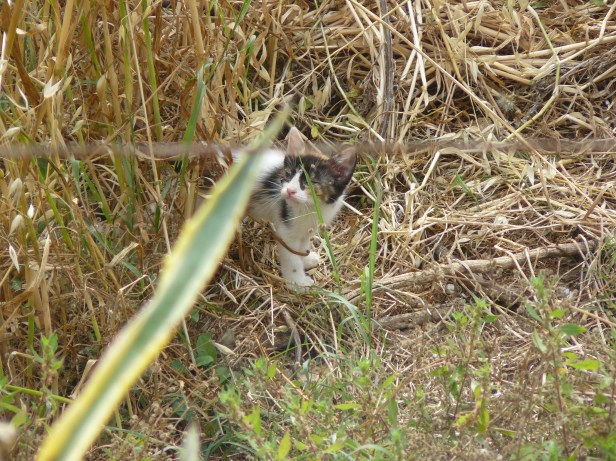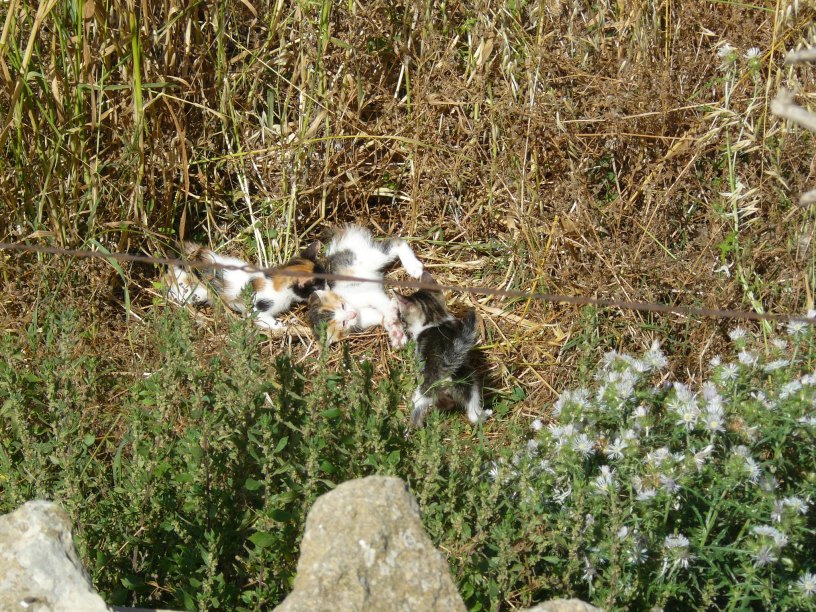 Spring came around and, once again, The Cat spent the first few weeks of her new family’s life in the fields before bringing them to The Cat’s Garden for weaning. The field was as exciting as ever for the three little ones, with undergrowth to hide in, the prickly pear with its trunks well-suited to practising climbing and wide, flat leaves perfect for napping, and the dry stone walls with their many crevices and hidey-holes.
