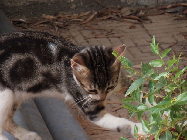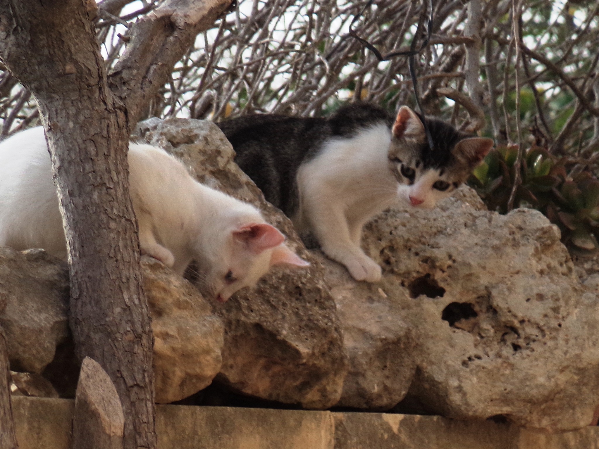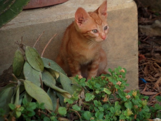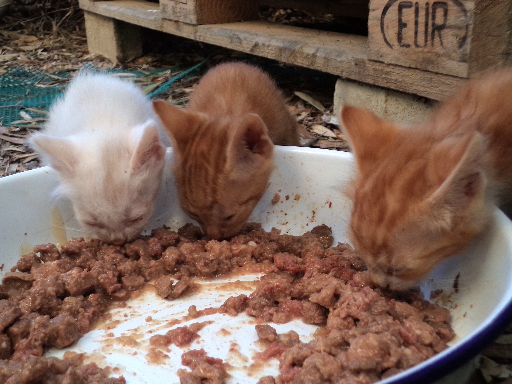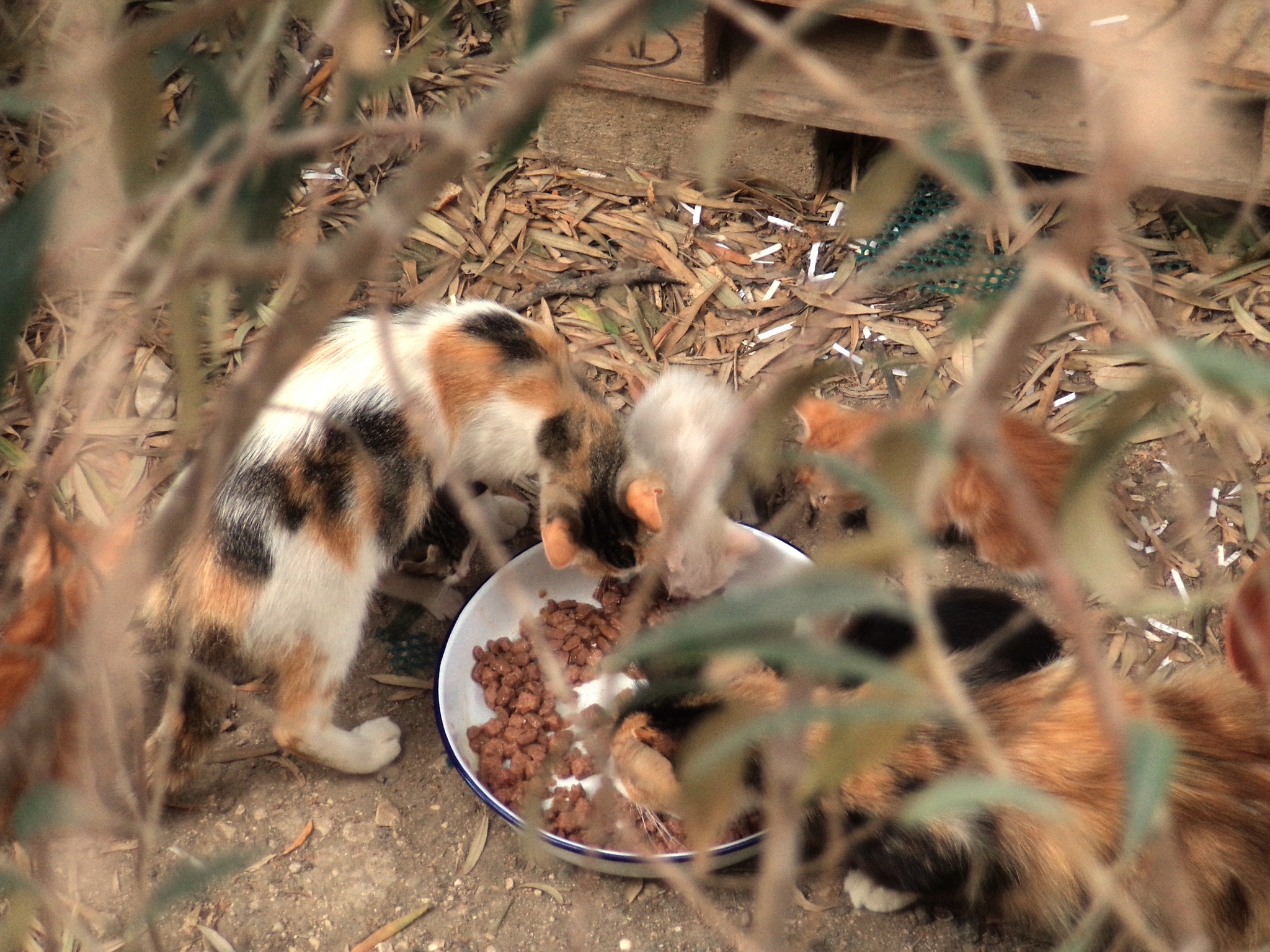 Their time on the terrace came to an end all too quickly and The Cat and Sprocket decided that it was time for the kittens to return to the garden. Sprocket carried them individually across the high wall and down the olive tree, starting with the biggest and ending with the smallest of the brood. The Cat watched approvingly and, the kittens all gathered under a little fig tree in the shade, it was she who led them all to the feeding bowl to start the next stage of their lives.