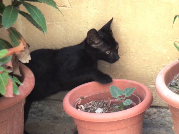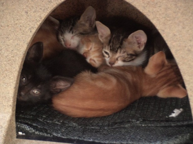 The pods were Sprocket’s choice of place for them to start their time in the garden. All the kittens fitted in one pod together, in a big pile of ears, limbs and tails – just as they would have been under the olive branches on the terrace.