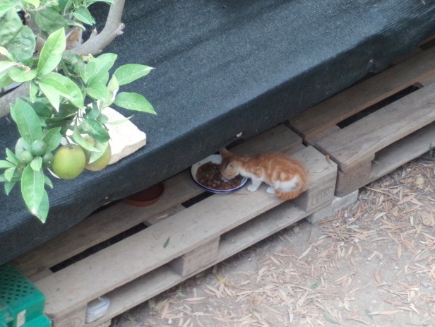 But the next day dawned, and he was still there, and still wailing. With the help of Dinky (who understood more than most the power of a loud and persistent miaow) and a bowl of food, we guided Lightning back to the garden (this time closing the gate firmly behind him) where he hid behind a water tank for a week, coming out at dusk and dawn, and when there were no humans around, to eat and drink.