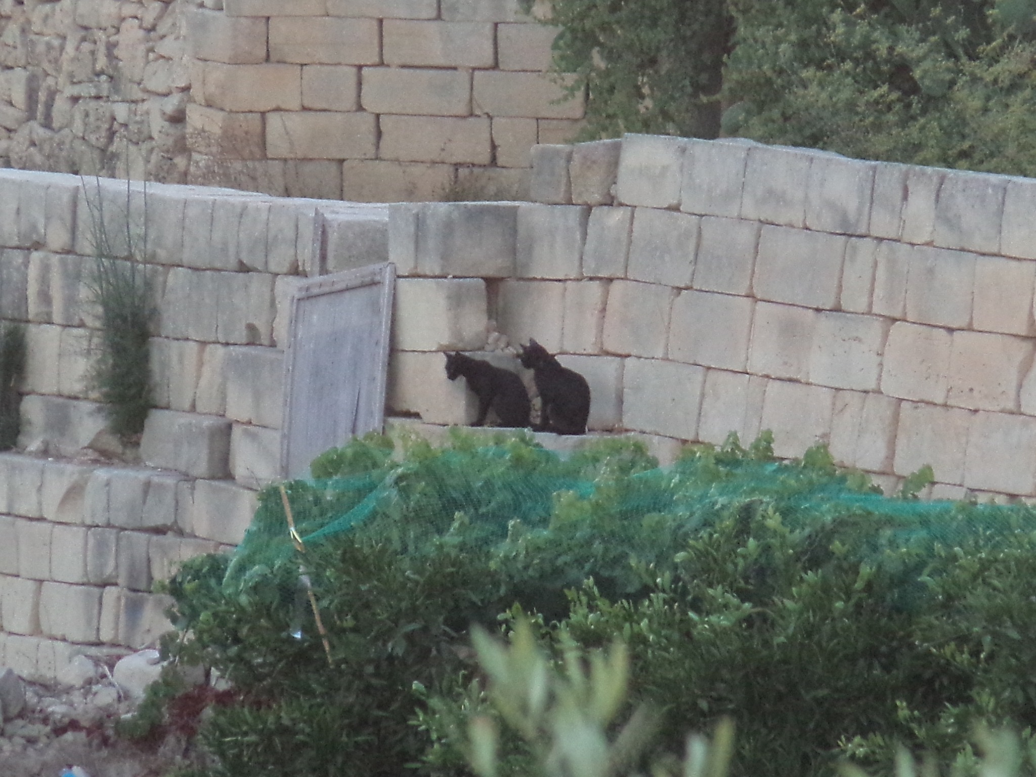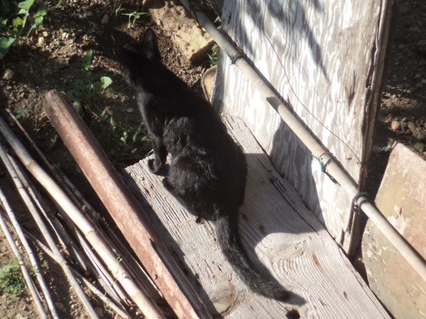 Longtail had been our first ever black Visiting Cat, so we were surprised to see him in the fields one day with another adult black cat, similar in many ways, but obviously malnourished and very shaky.