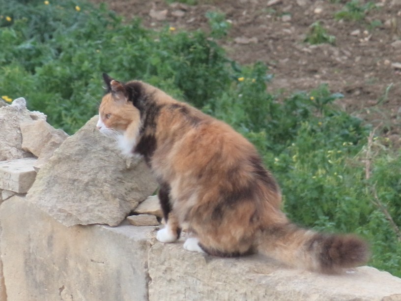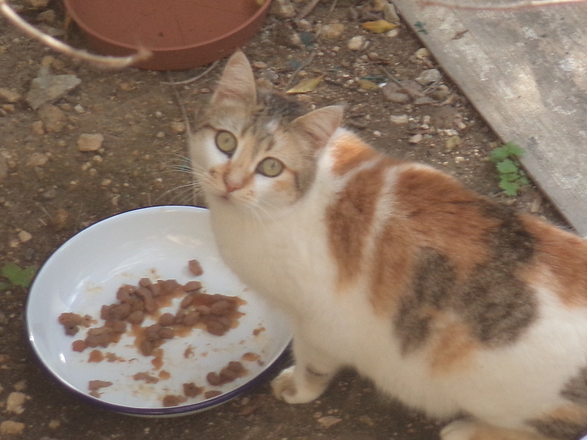 And last but not least, Sniffly Cat, a sweet and mild-mannered calico who came from the same garden across the fields as Visitor Cat. She wasn’t friendly, but on the other hand she didn’t seem frightened of humans in the same way as some other cats, like Sultan.