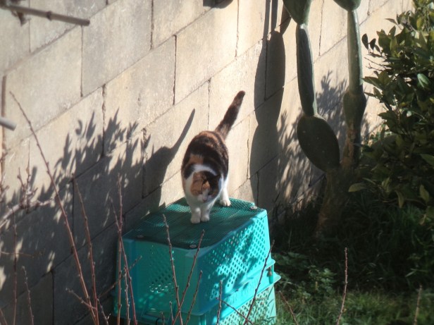 And another new face was Twilight, a feral tortoiseshell cat who also spent time in the culvert and the local vineyards . She was completely feral and, to start with, never visited the garden, eating only in the drive or front path. Unusually for a female, she covered quite a large area, although she didn’t seem friendly with many of the other feral cats with the exception of NVQ, the bad boy of the neighbourhood.