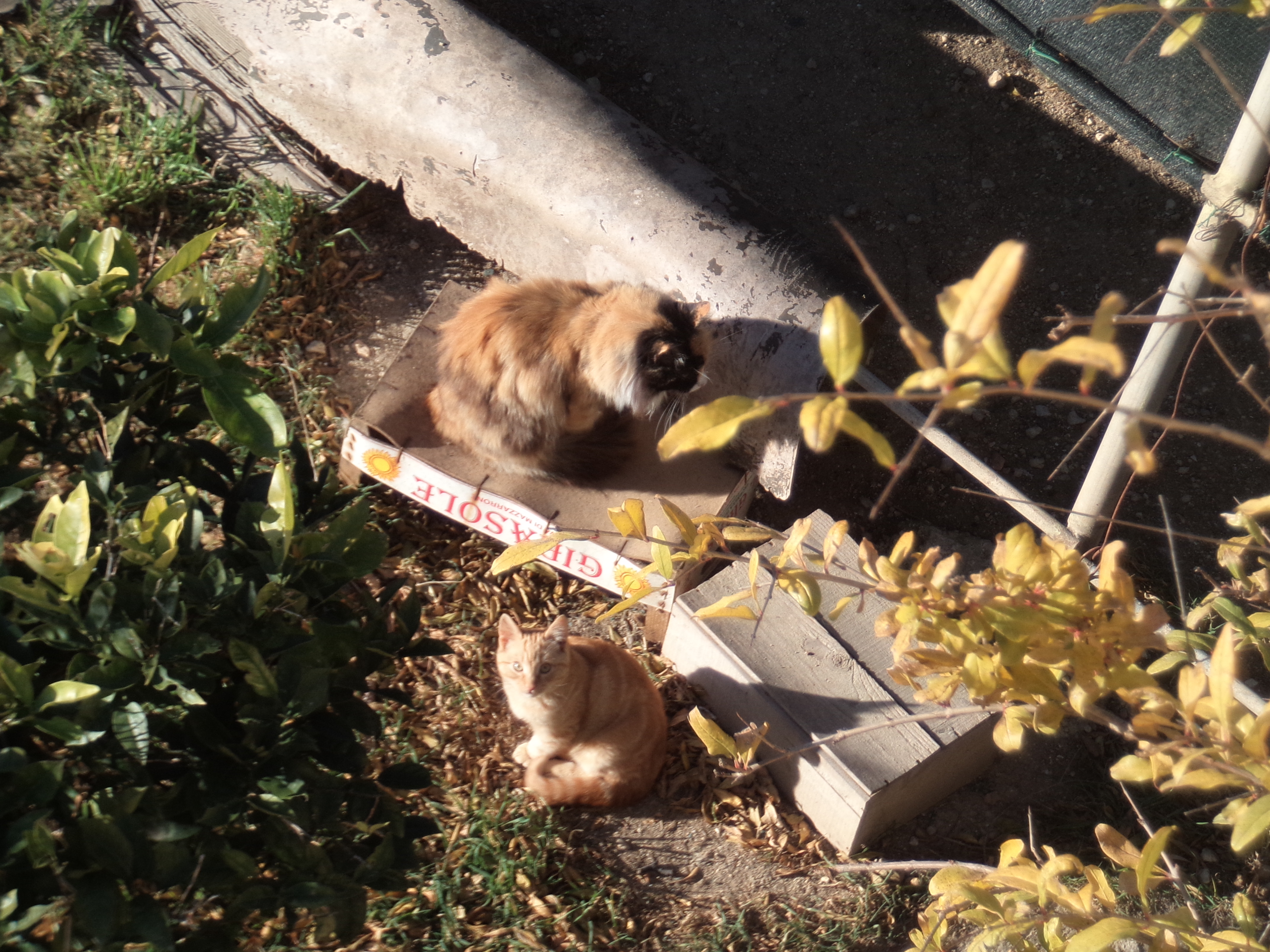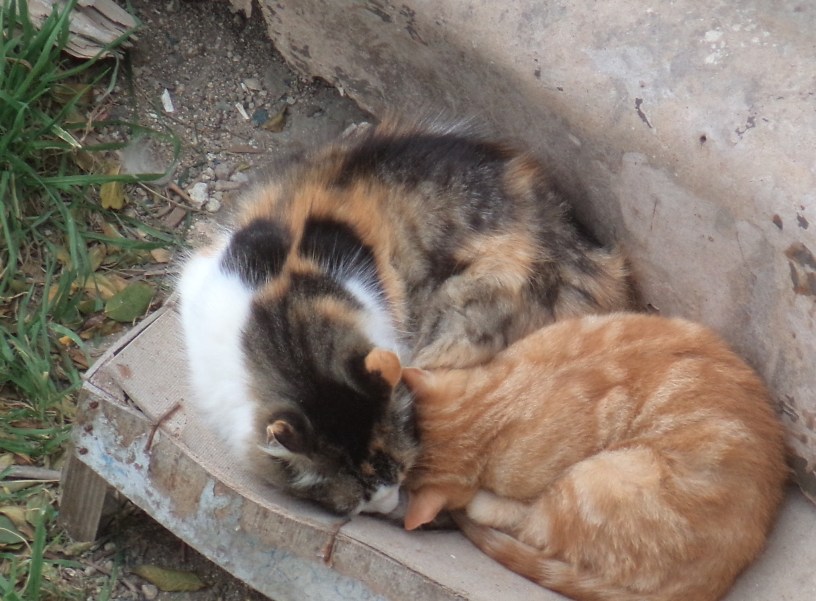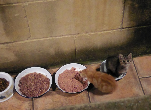 Visitor Cat was still coming to eat regularly (on top of the wall, and out of the way of The Cat – she had learnt her lesson). That autumn, she had two kittens out in the fields – a little tortoiseshell girl and an orange boy, and, when the time was right for weaning, she brought them to the food bowls in the front path after dark and introduced them to the joys of wet food, munchie-crunchies and fresh water. They invariably visited at dusk or after dark, so there are few photos, but those that there are, show Wee Tortie sitting in a bowl while her brother Wee Ginge samples the other dishes – maybe that was her way of saying ‘compliments to the chef’.