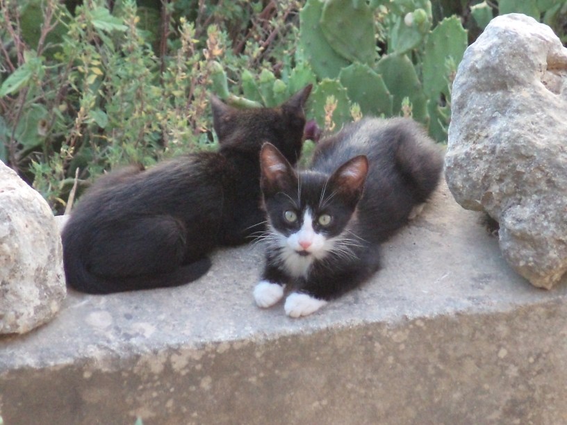 It wasn’t just The Cat who was kept busy with a new family as Visitor was also looking after kittens, in the neighbouring field. We named them collectively The Nearbys as the closest we could get was to peer over the high wall and watch them across the fields. We could see there were four little ones who seemed bonded in two pairs – two very similar black kittens made one pair, and the tuxedo and an orange kitten made the other. We named the black kittens Cheese and Cracker, the tuxedo T and the orange kitten Biscuit.