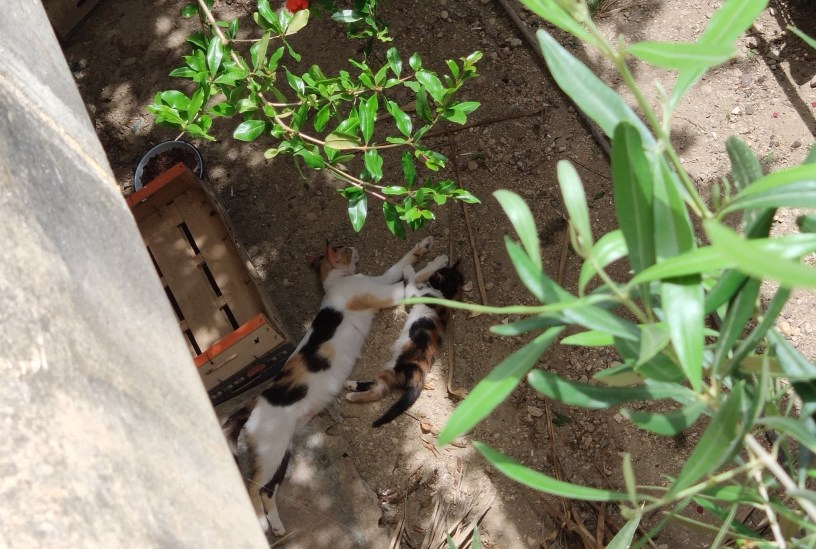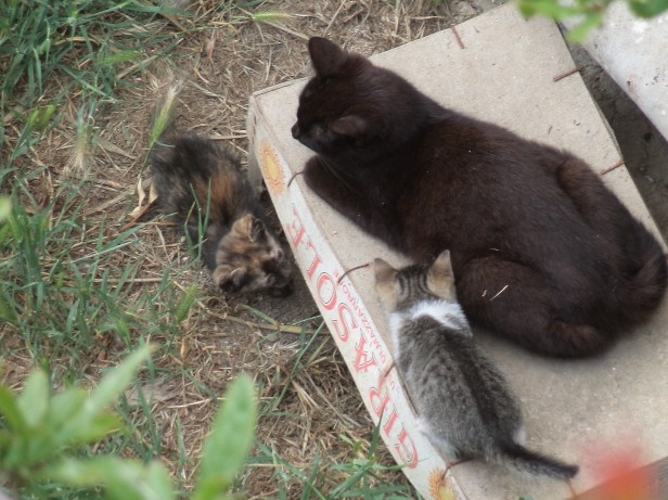 A few weeks previously, Visitor Cat’s twin daughter Cracker had also had kittens which she now brought to the garden from the fields for weaning.