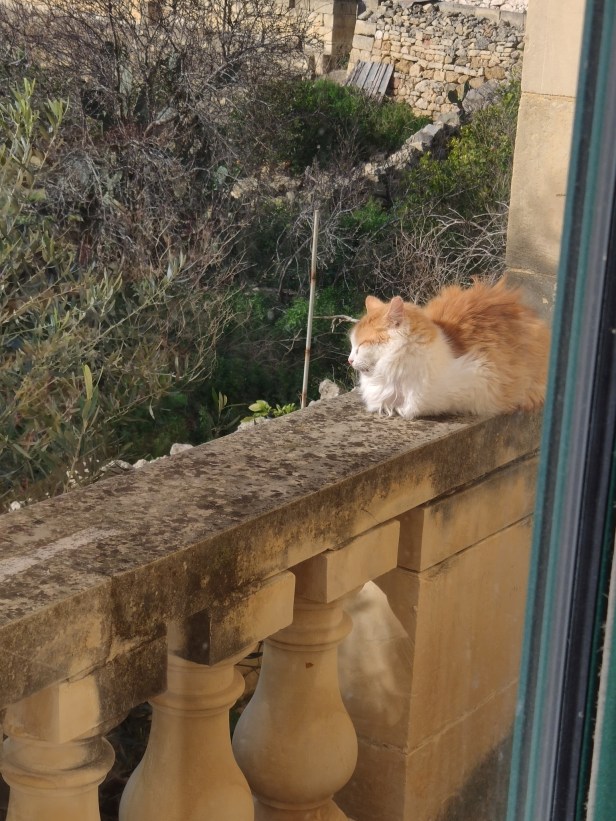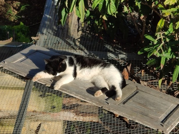 We rarely saw her venture out these days, especially since the road and dry stone walls were being replaced (which was another big change in the neighbourhood), causing huge disruption in the fields, not to mention fundamental changes to access for the farmers (and the cats) from the road to the fields. Some cats had given up trying to negotiate the endless mud and piles of stone, and decided to remain on the other side of the road, being fed by the farmers who had their fields there, just as they had done before we arrived at the house.