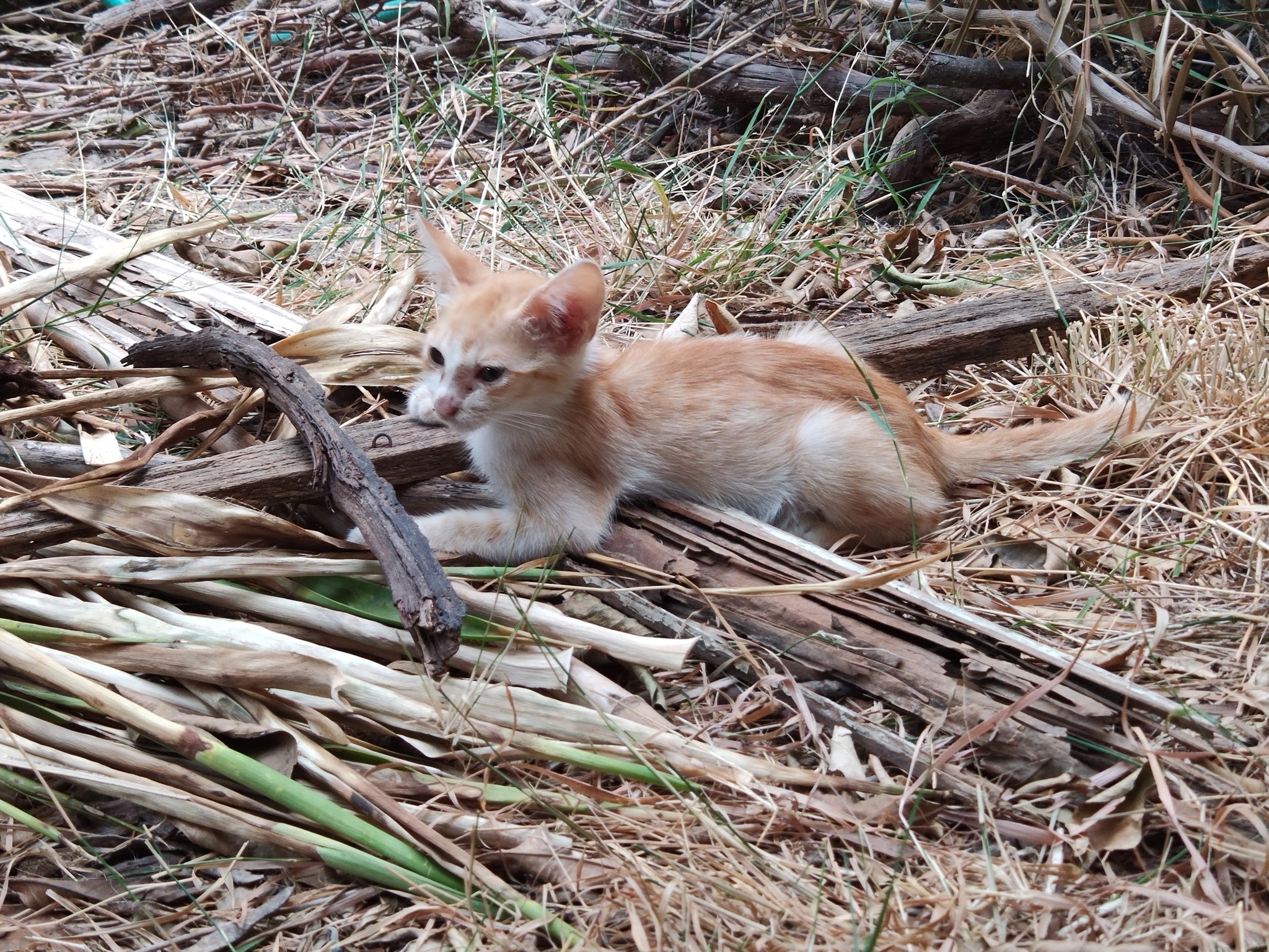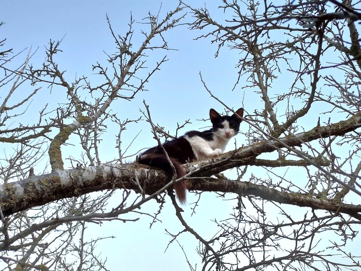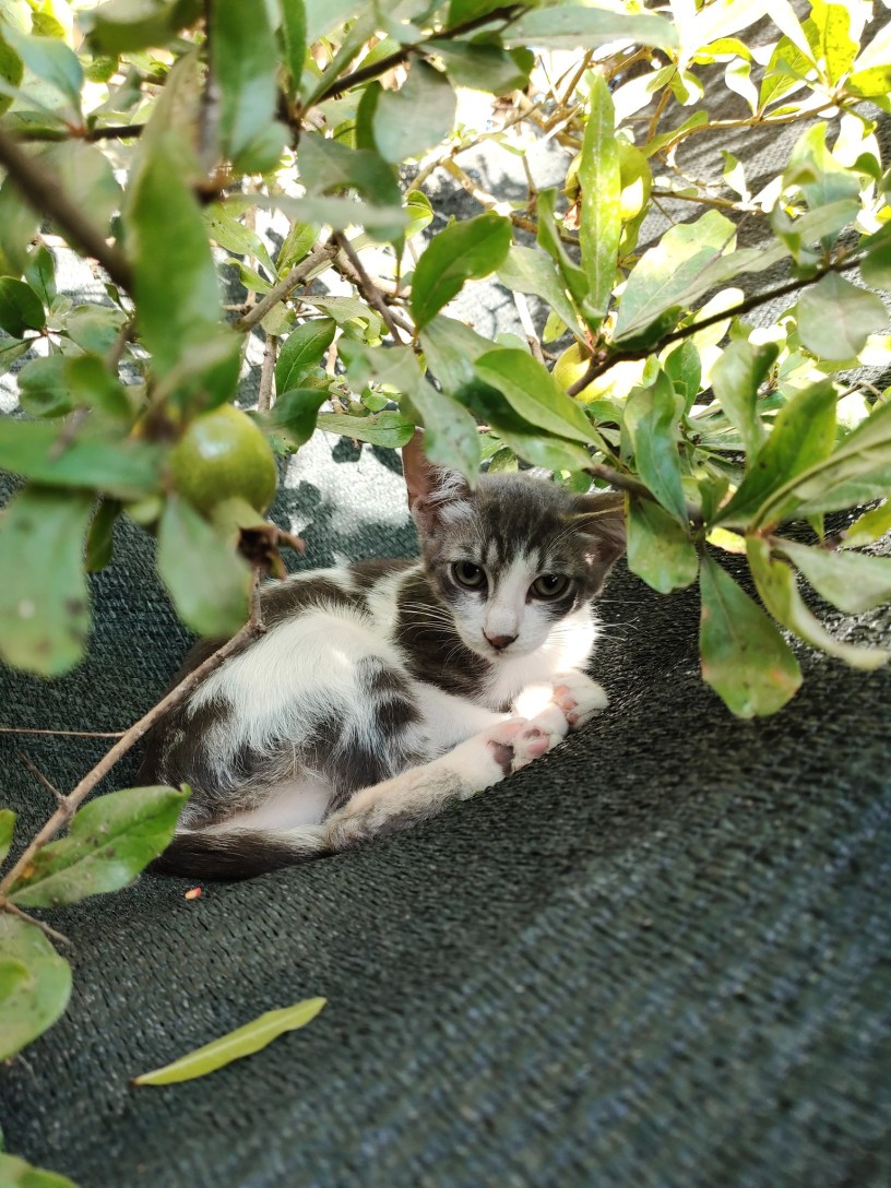 Flora and her kittens had been spared; girls Swift (calico) and Satsuma (the little orange-and-white runt) continued with their lives as usual. Satsuma was still small compared to the others, but she seemed happy and healthy. Together with their brother Checkers and Dandy Grey (pictured on the header photo), they were the biggest family group of the garden.