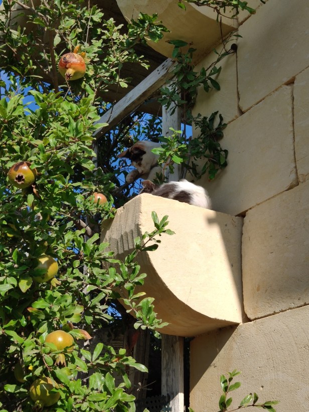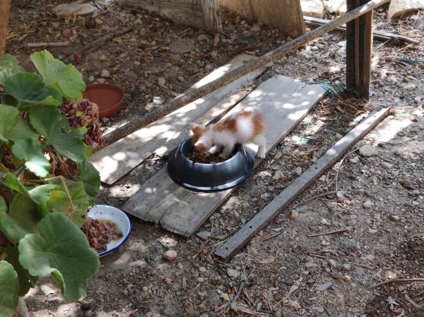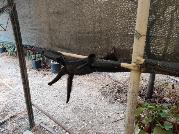 …Swift napping. These fence posts were supposed to provide a sloping link between the feeding station and the top of the water tank to help less able and older cats access the water tank without having to climb up the olive tree. But more often than not, passage was blocked by a slumbering feline who had decided that this was the best possible spot for an after-dinner nap.