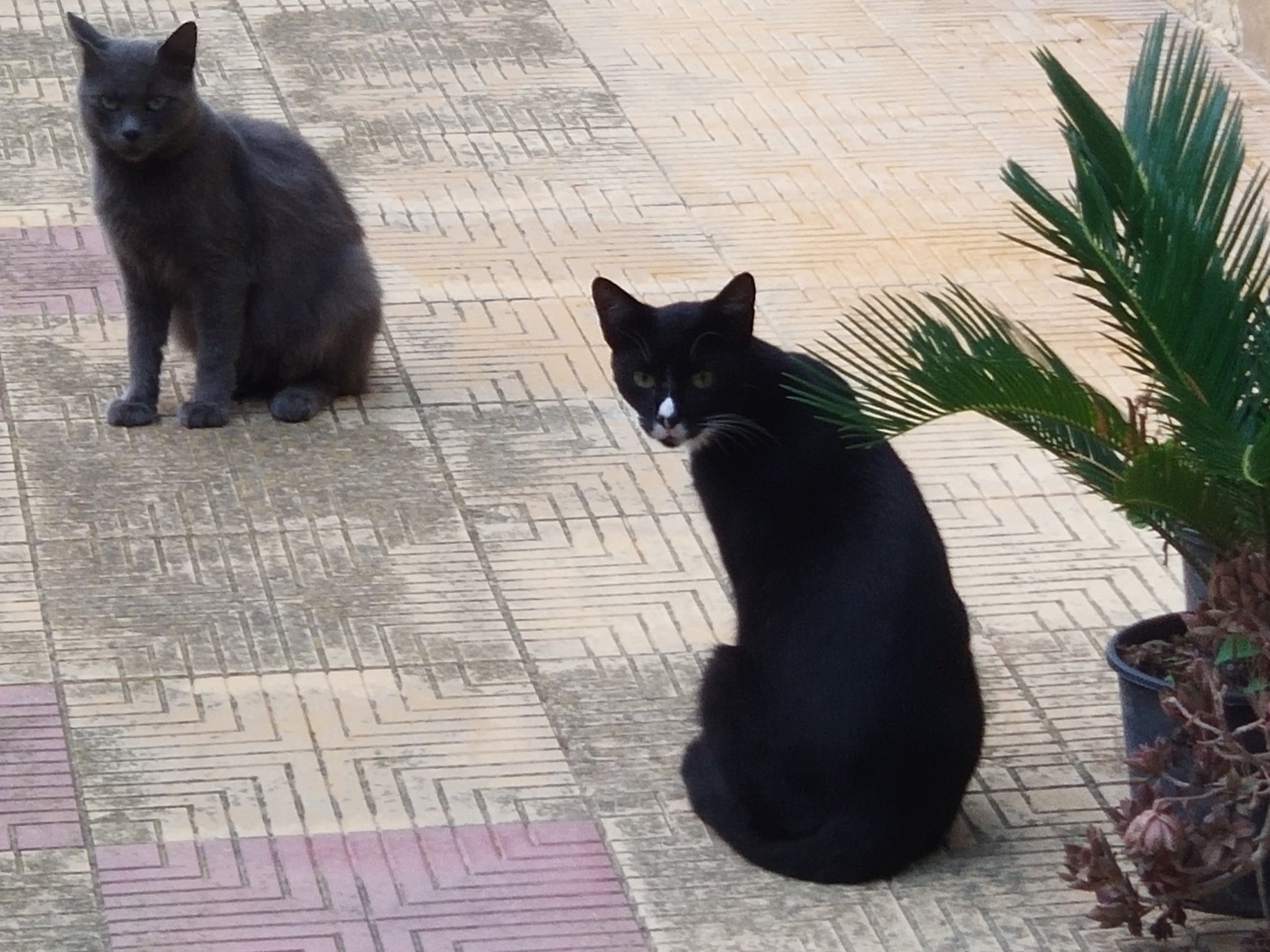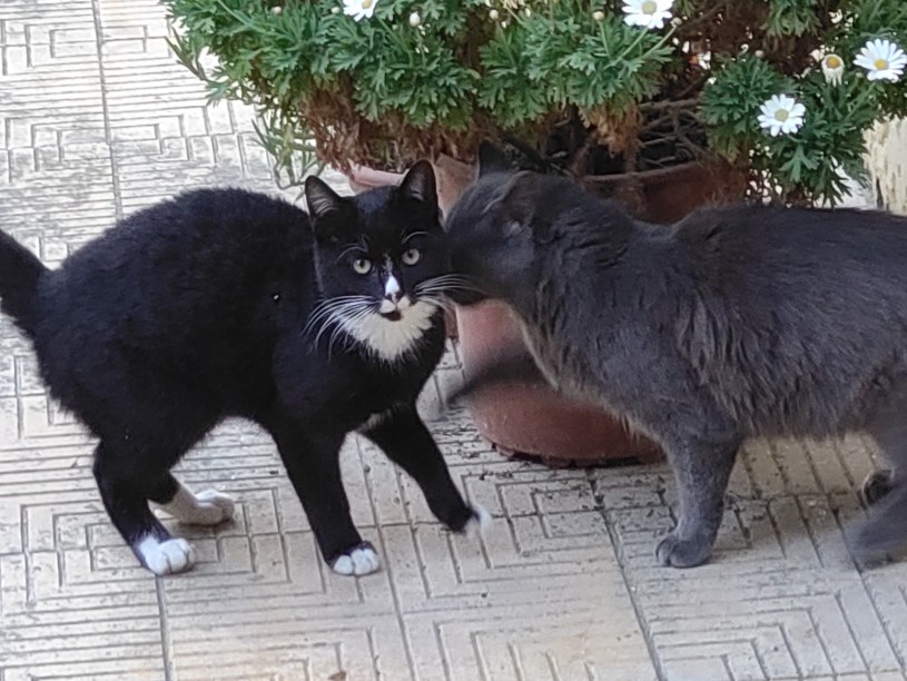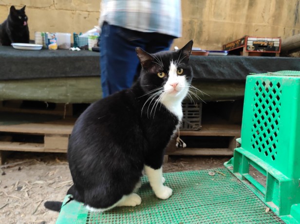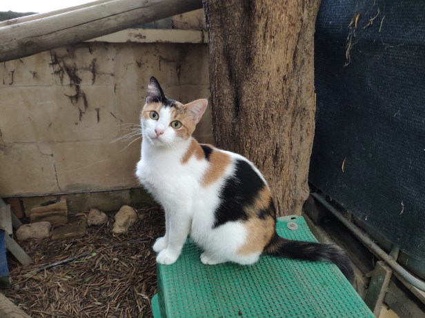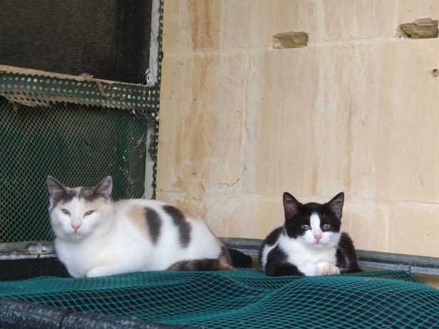 Three of She-ba’s kittens were coming to eat and the girls, Sundown (a dilute calico) and Moonstruck (black-and-white like her father, NVQ) set up home in the garden. Their brother Cosmos, for some reason, gravitated to live near the garden on the other side of the fields where Visitor Cat, BBC and Ghost came from. Sundown had become strongly bonded with her big sister, Mini. Moonstruck was the runt of the litter and had an awful flea infestation which meant she had to be socialised in order to be treated. Fortunately, this only took two days as she had such a lovely disposition; it would have been a very different story, had it been Sundown. After that, Moonstruck was fully integrated with the Garden Family while Sundown and Mini, both wary and not keen on humans, stayed slightly apart.
