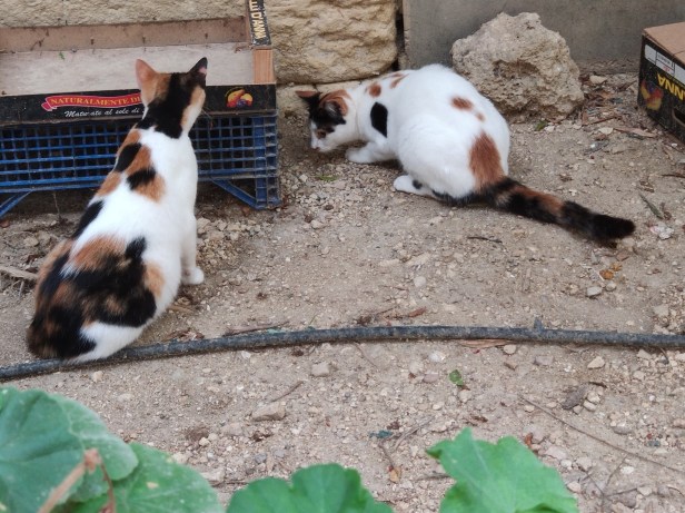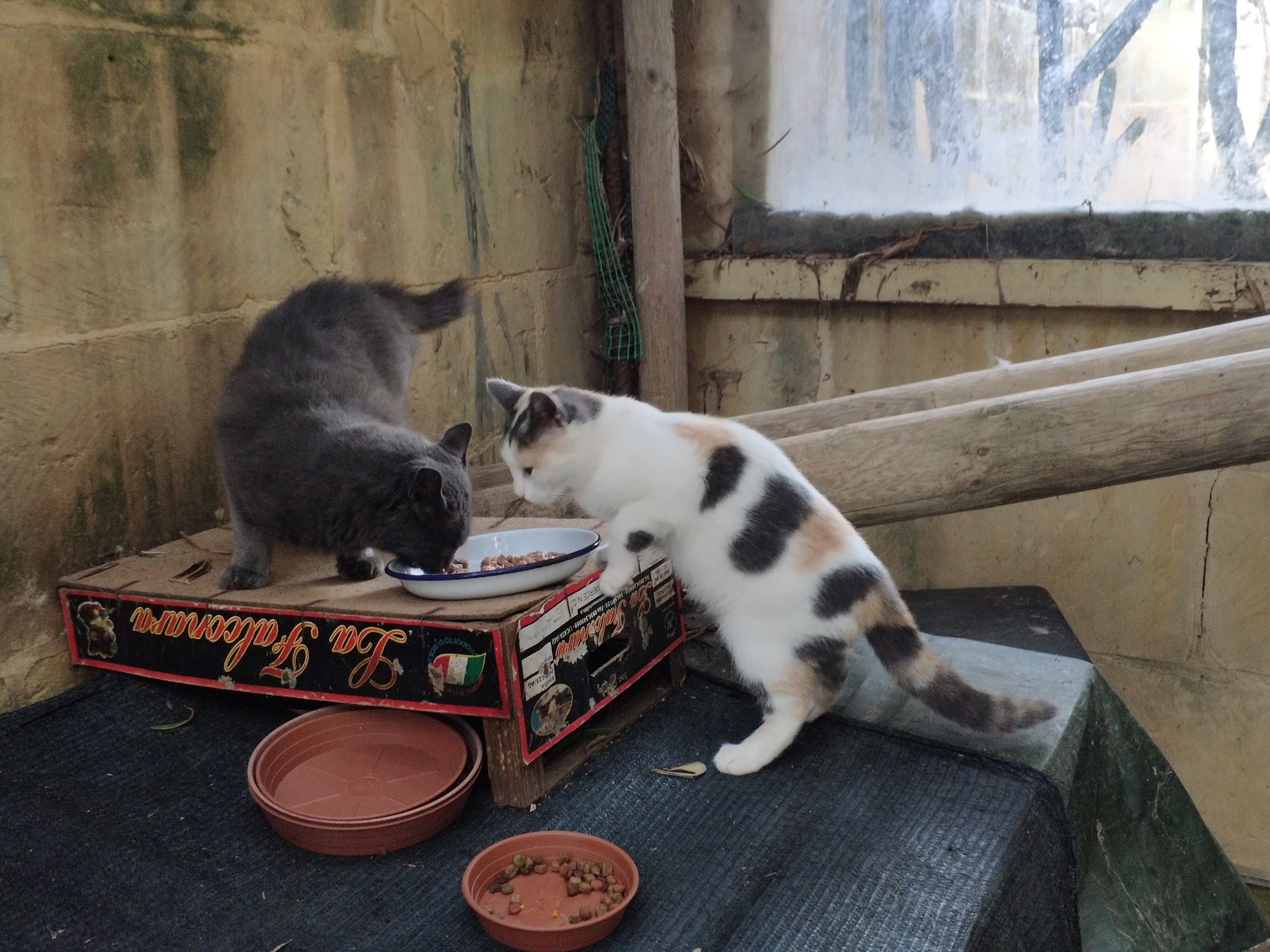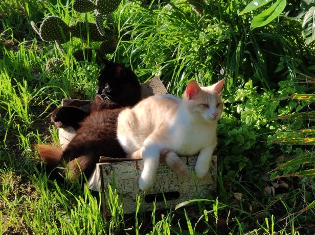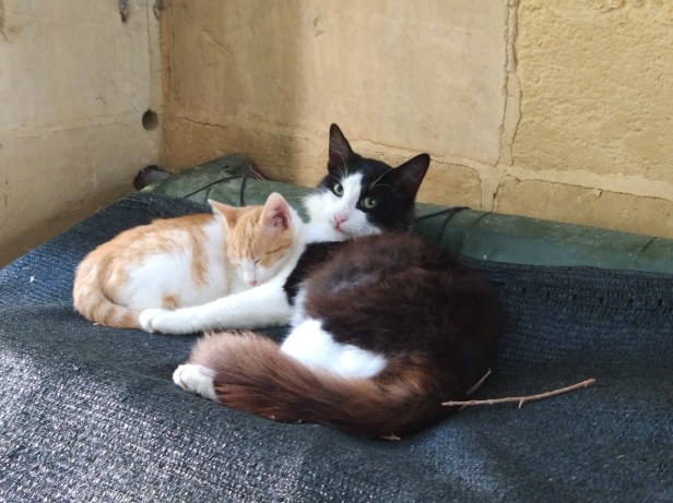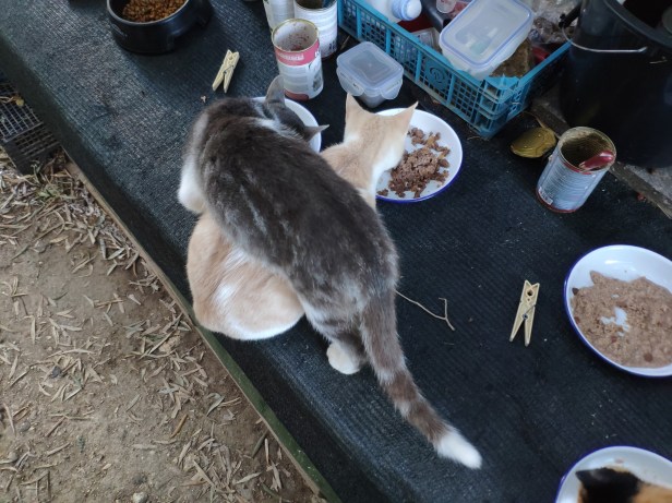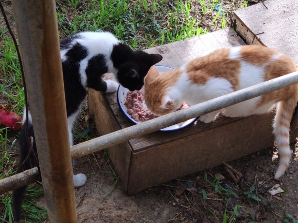 And finally, Flora’s son Dandy Grey and Pippin’s son Pascha eating in the sort of configuration which only cats can manage successfully.