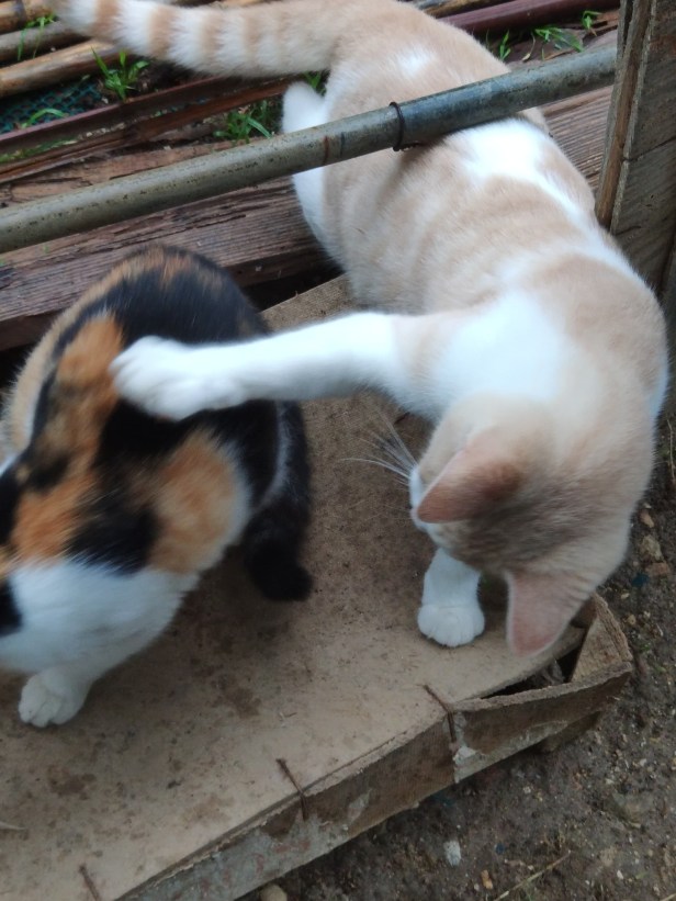 Pippin’s son Pascha playing with Dawn’s daughter Linnet. Pascha had lost a lot of his sight through a virus as a kitten and had not been well enough to interact with the other kittens in the usual way. Although his sight was permanently impaired, he was had blossomed into a big, healthy young cat and was making up for lost time and finding tussle-buddies among his compatriots in the garden.