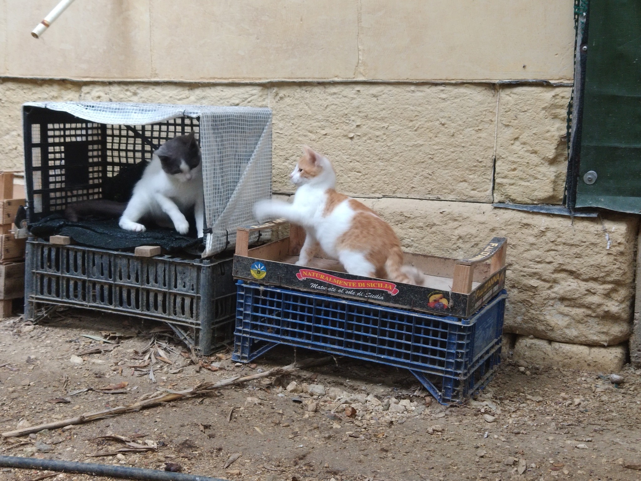 Phantom’s daughter Shady and Dawn’s son Sherpa playing. Shady was older than Sherpa but, due to malnutrition, very small for her age. Being the runt of the litter, she had not been able to keep up with her siblings and had not had the opportunities to play and interact that a normal kitten would have. With Sherpa growing up in the garden, she at last had someone to play with and it brought out the kitten in her.