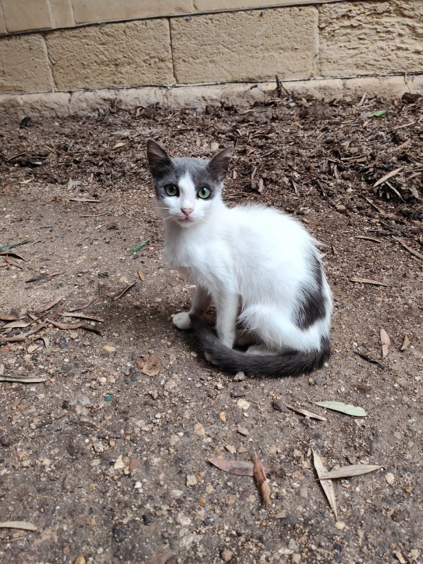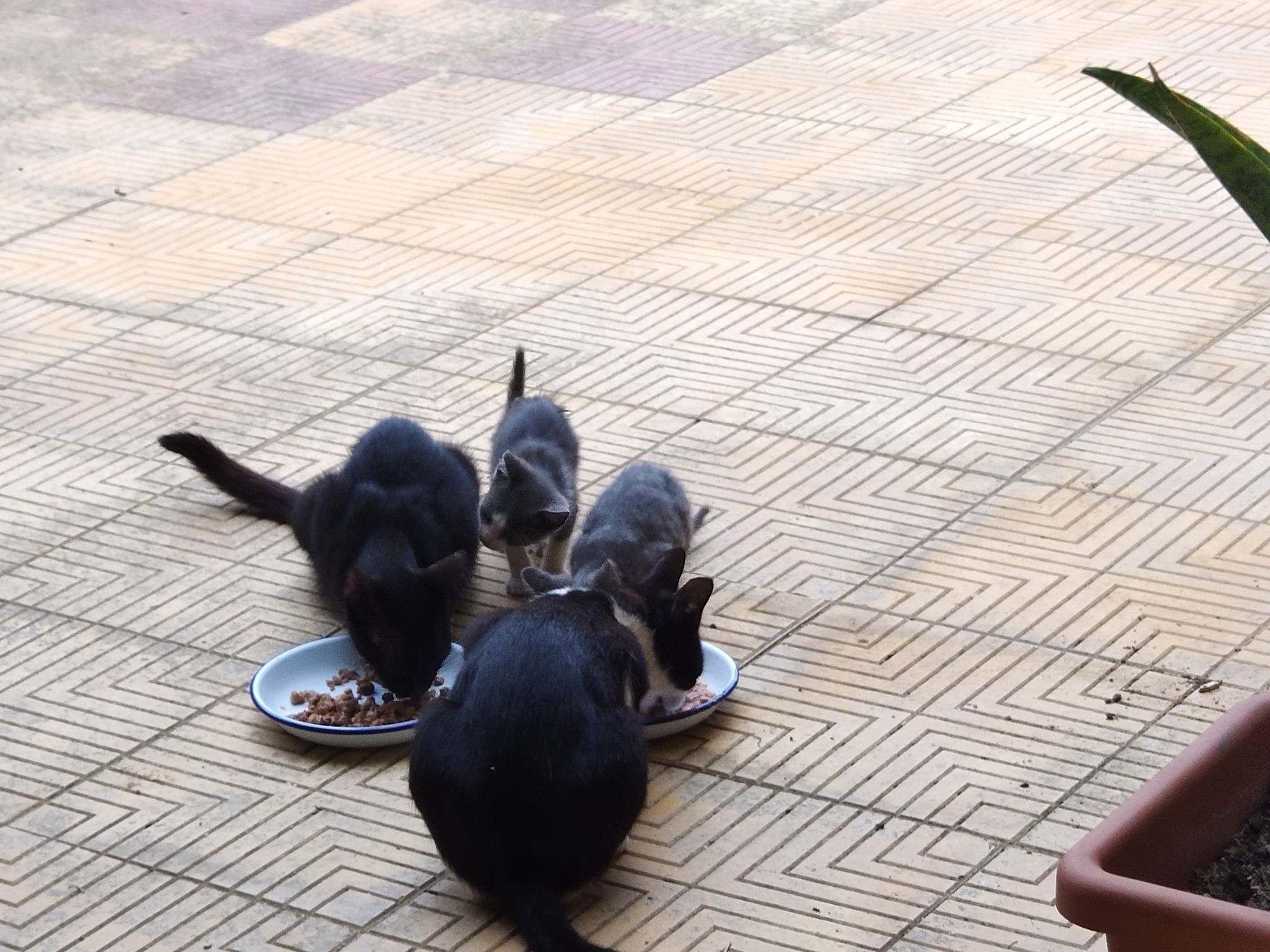 So, when it was time for Phantom’s new litter to be weaned, it was naturally to the drive that their mother brought them. There were three – a grey-and-white boy who we named Splendid, and two more – a grey kitten, and a black kitten. Kiwi, Phantom’s best friend, named them Silk and Velvet. She enjoyed spending time with Phantom and her family, supervising their mealtimes generally being part of their family group.