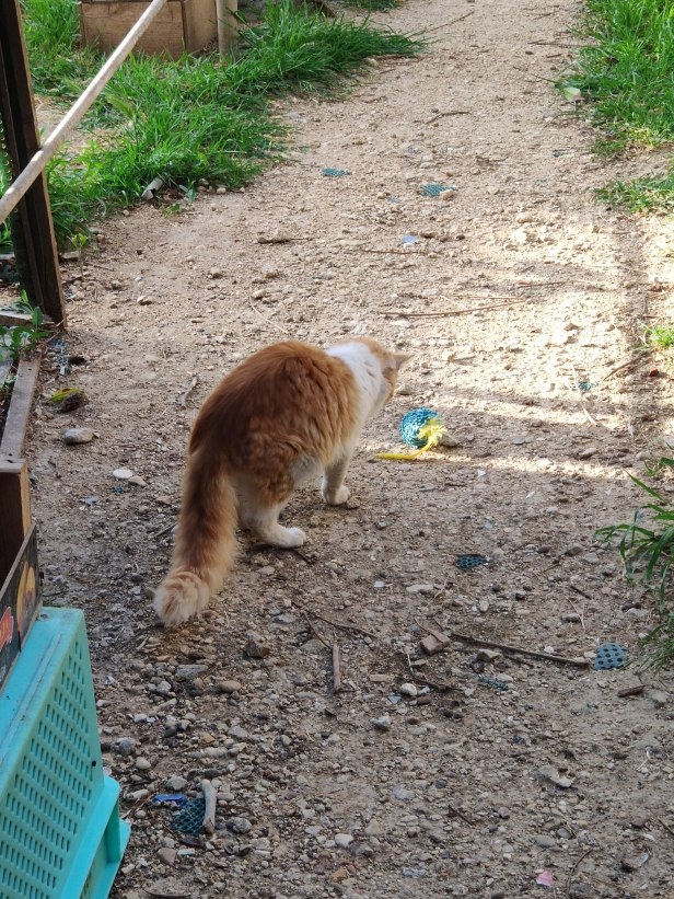 And then, one day, his tail was dragging behind him. He couldn’t hold it up or control it, and upon inspection, there were two places where it was kinked and the fur and flesh was missing, exposing the musculature. Ana did not seem bothered by it, and, over the next few weeks, it withered and fell off in two sections leaving him with a stump and earning him the surname ‘Half-Tail’; in fact, he became known locally as ‘the cat with the aerial’.
