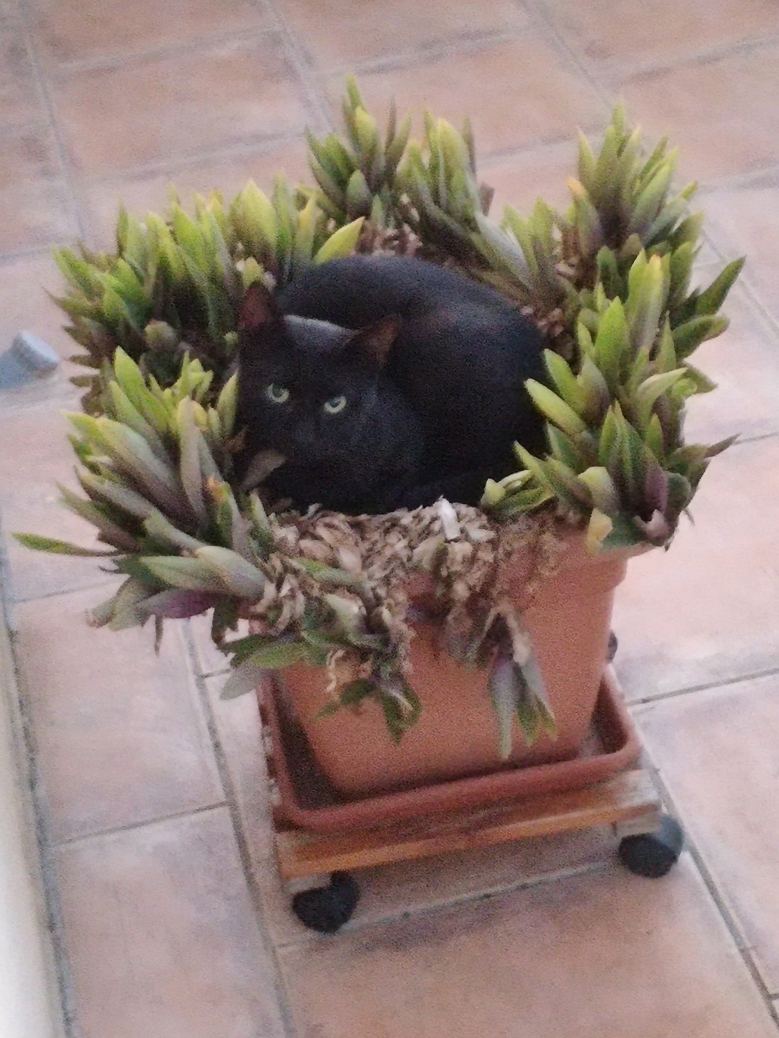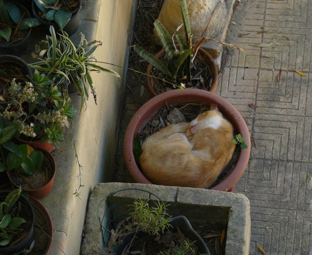 Phantom’s kitten Mohi was just the right size to snuggle down into the middle of the plant for her siesta, almost disappearing down into the trough.
