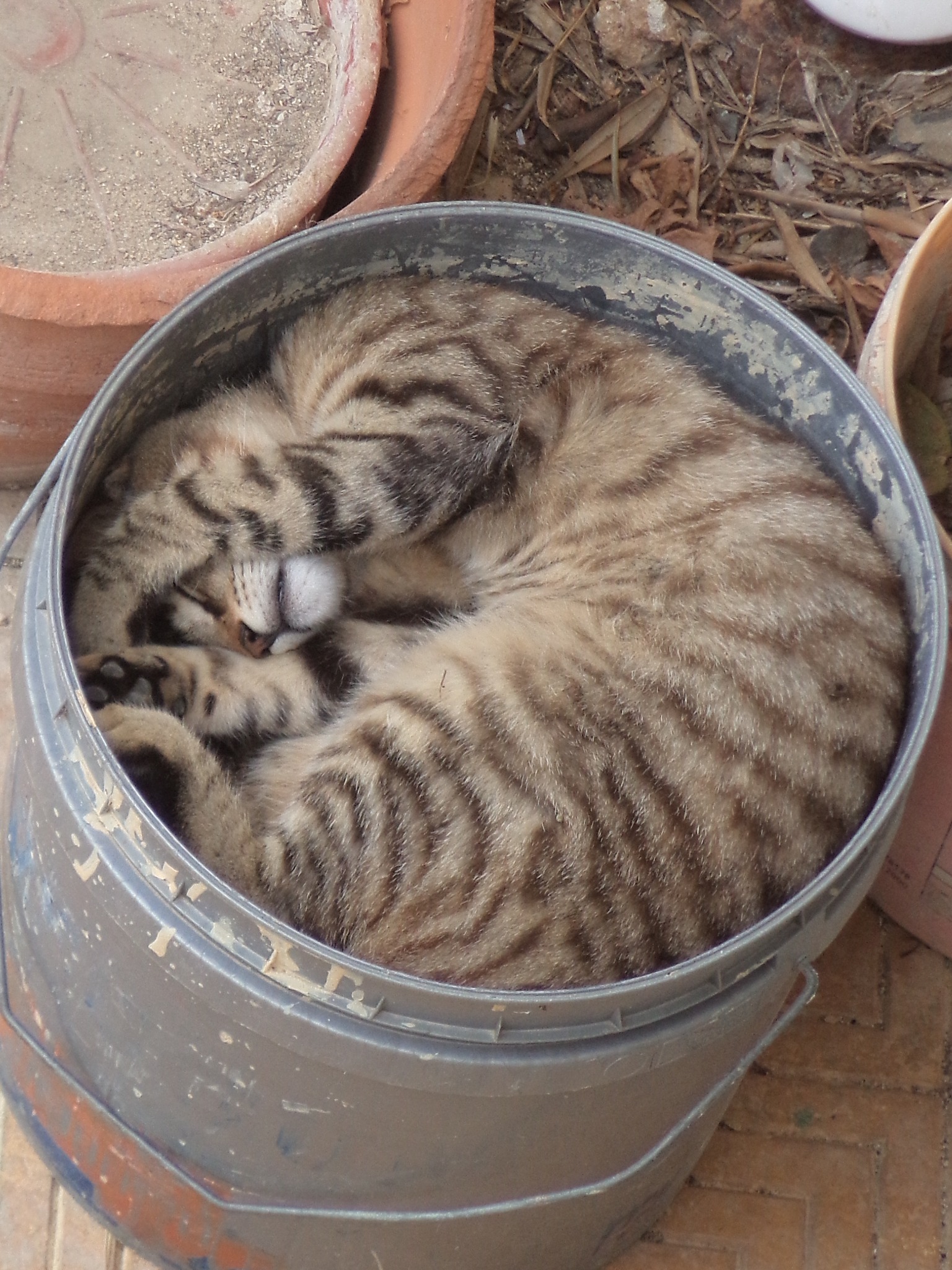 Plant pots and pails were eternally popular with the cats and kittens. Maybe they were not as smitten with them as Sprocket was during her life, but there were not many of The Garden Family or Visiting Cats who did not at some time or other make themselves comfortable in a plant pot or a pail. Maybe it was the cool soil, maybe the soft cushioning of the leaves, or maybe the shape that made them so tempting.
