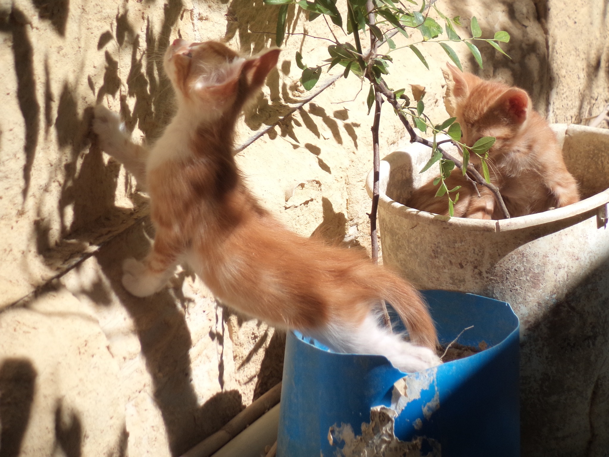 The pots made excellent launchpads for attacks on the higher branches of the shrubs, and Tippex and Early Lately spent a lot of time playing with the moving shadows of the branches and leaves on the wall in the afternoon sun.