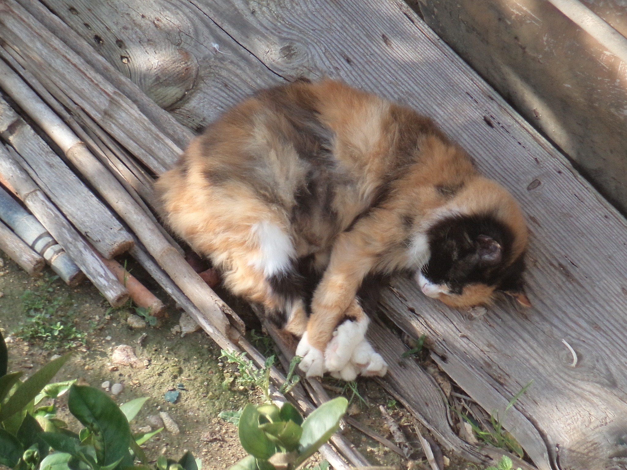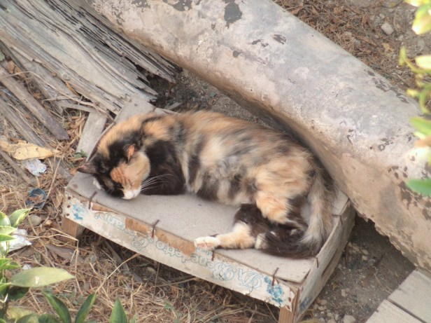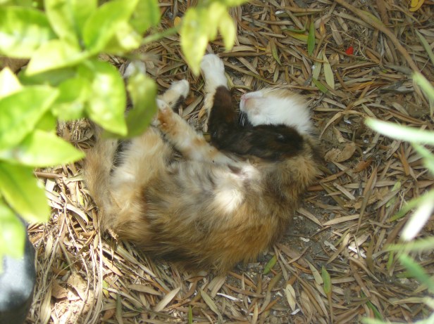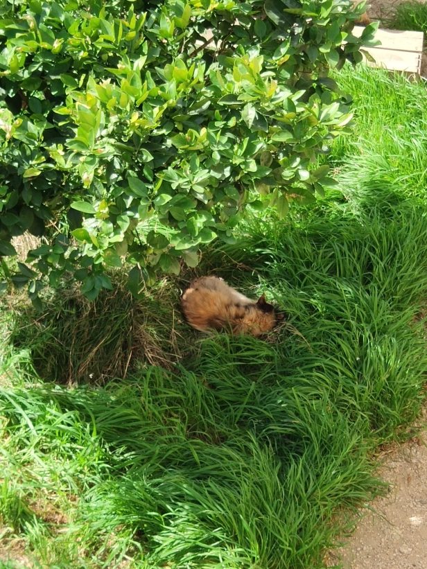Dreaming her dreams under the citrus trees in the garden, on a bed of dried olive leaves.