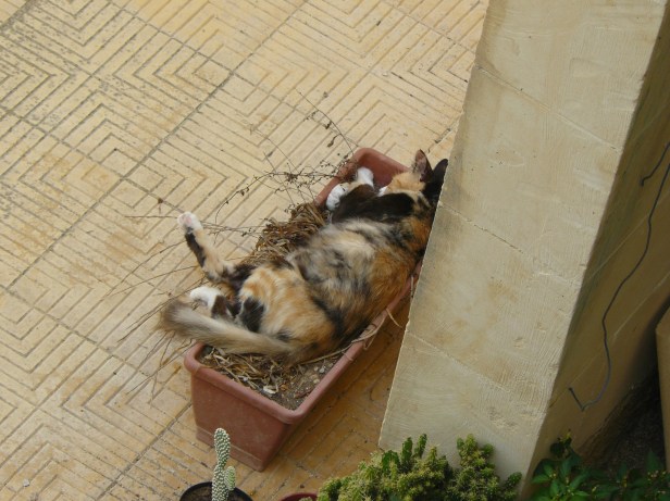 Classic behaviour from The Cat, as Ana used to like to nap in this trough. Of course, that made it even more attractive to her and she would while the afternoons away napping while Ana stood over her, wishing that staring would make her move so he could occupy it. Needless to say the plants had died long ago.