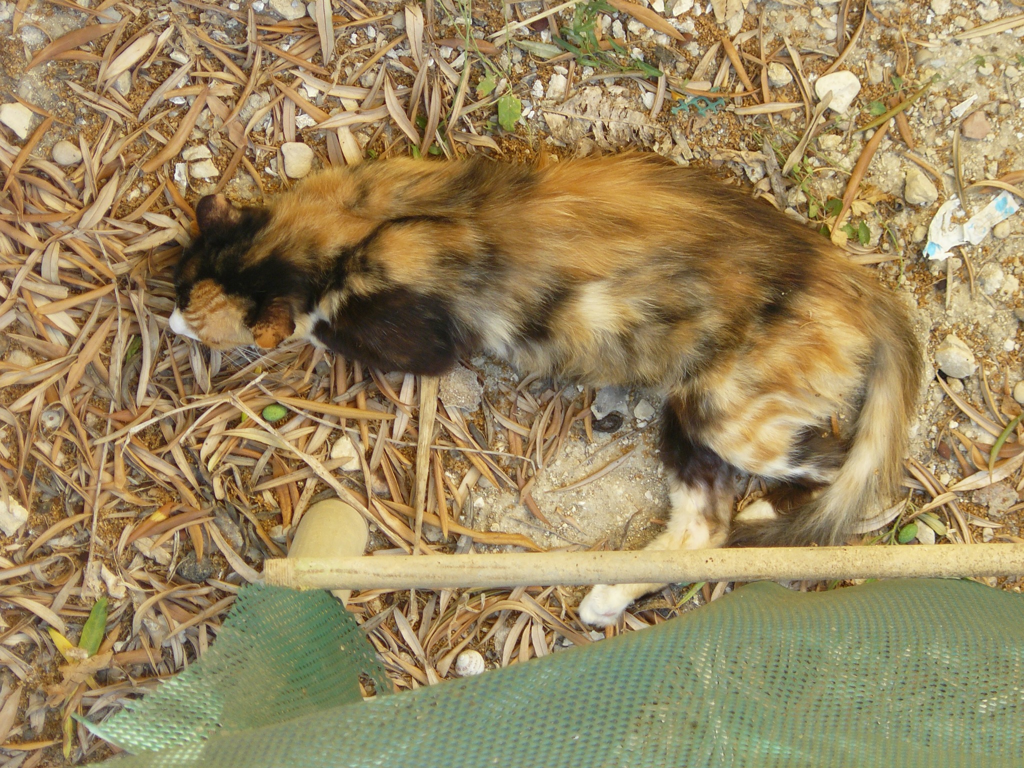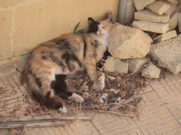 Fast asleep in the drive. Just over the wall was the garden with comfortable boxes and cushy grass, and the verandah for added shelter, but no – The Cat preferred this corner of the drive, lying on top of the old leaves and brushed up rubbish, with her head on a stone. Surely that cannot have been comfortable!