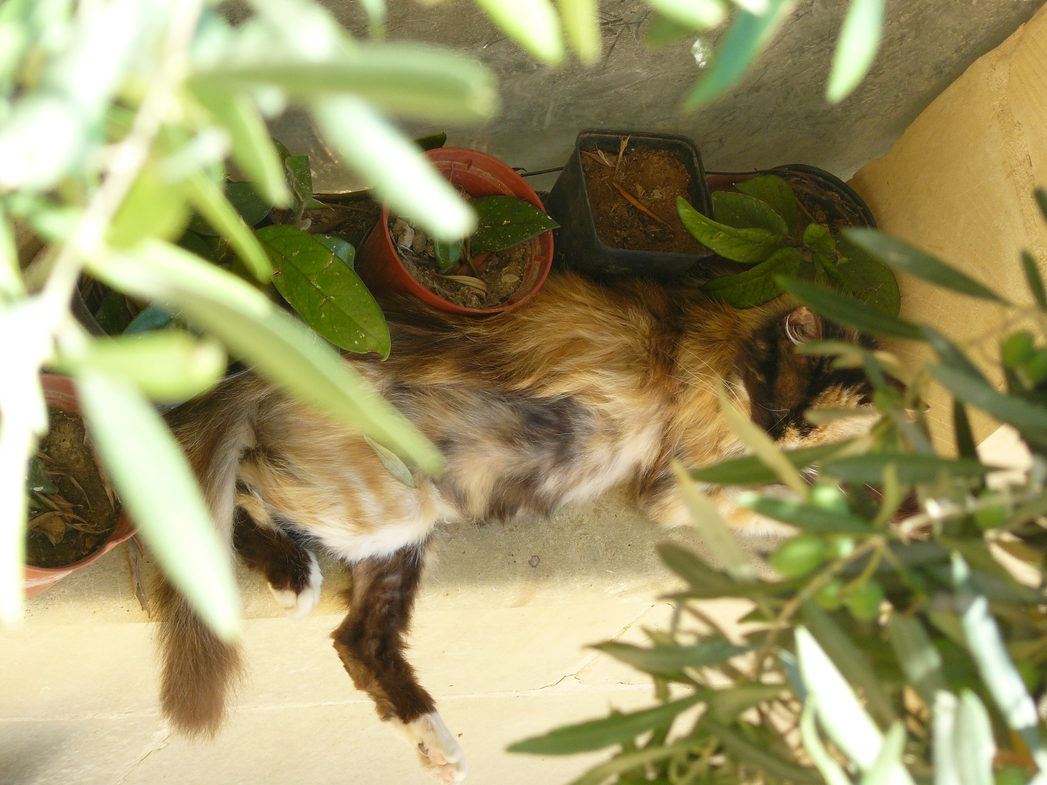 The Cat was an exceptionally long cat, and her colours blended so well with the dried olive leaves which she liked to lie on in the garden.