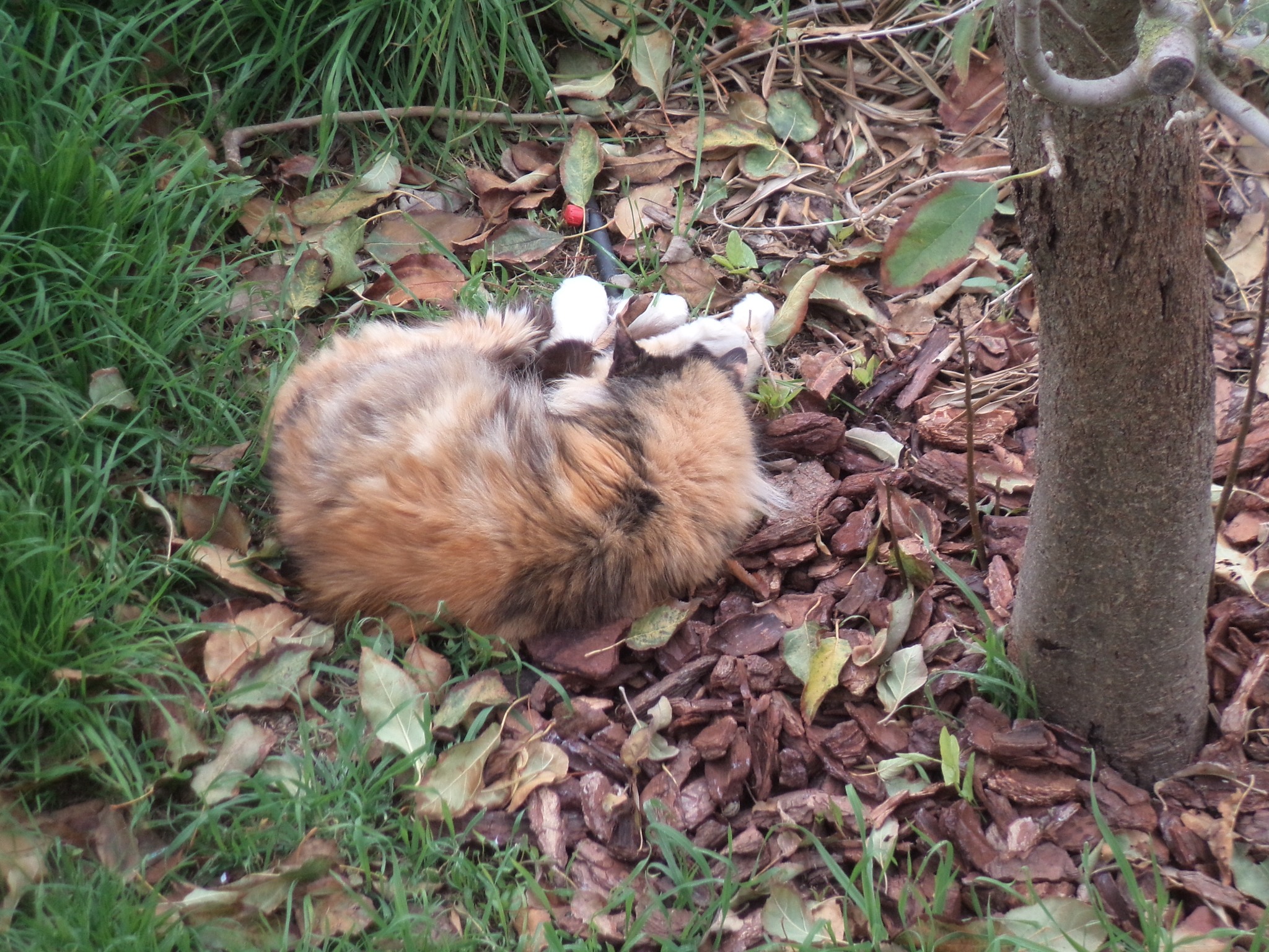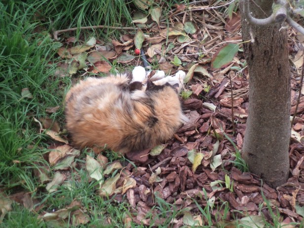 Yes, of course it was comfortable. Of all the places in the garden, The Cat chose to lie on top of an irrigation pipe complete with taps, on top of chunky bark spread under one of the citrus trees – what could be more cosy and soft?