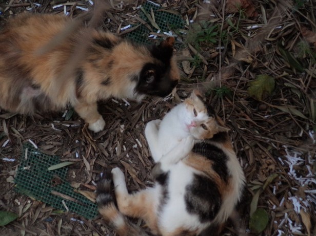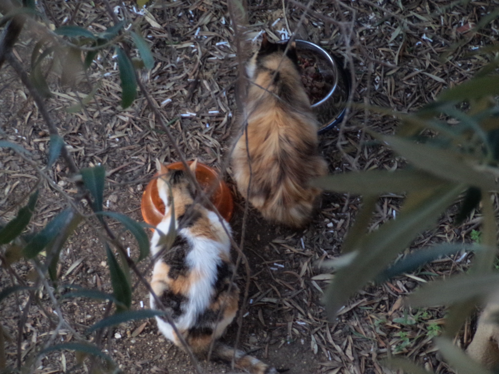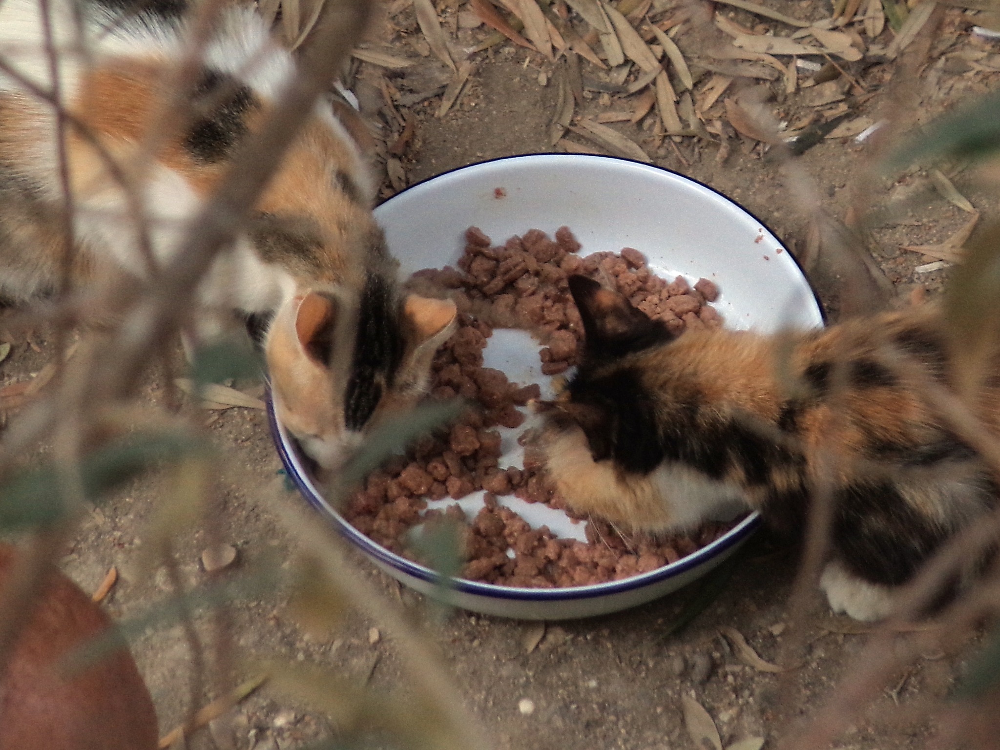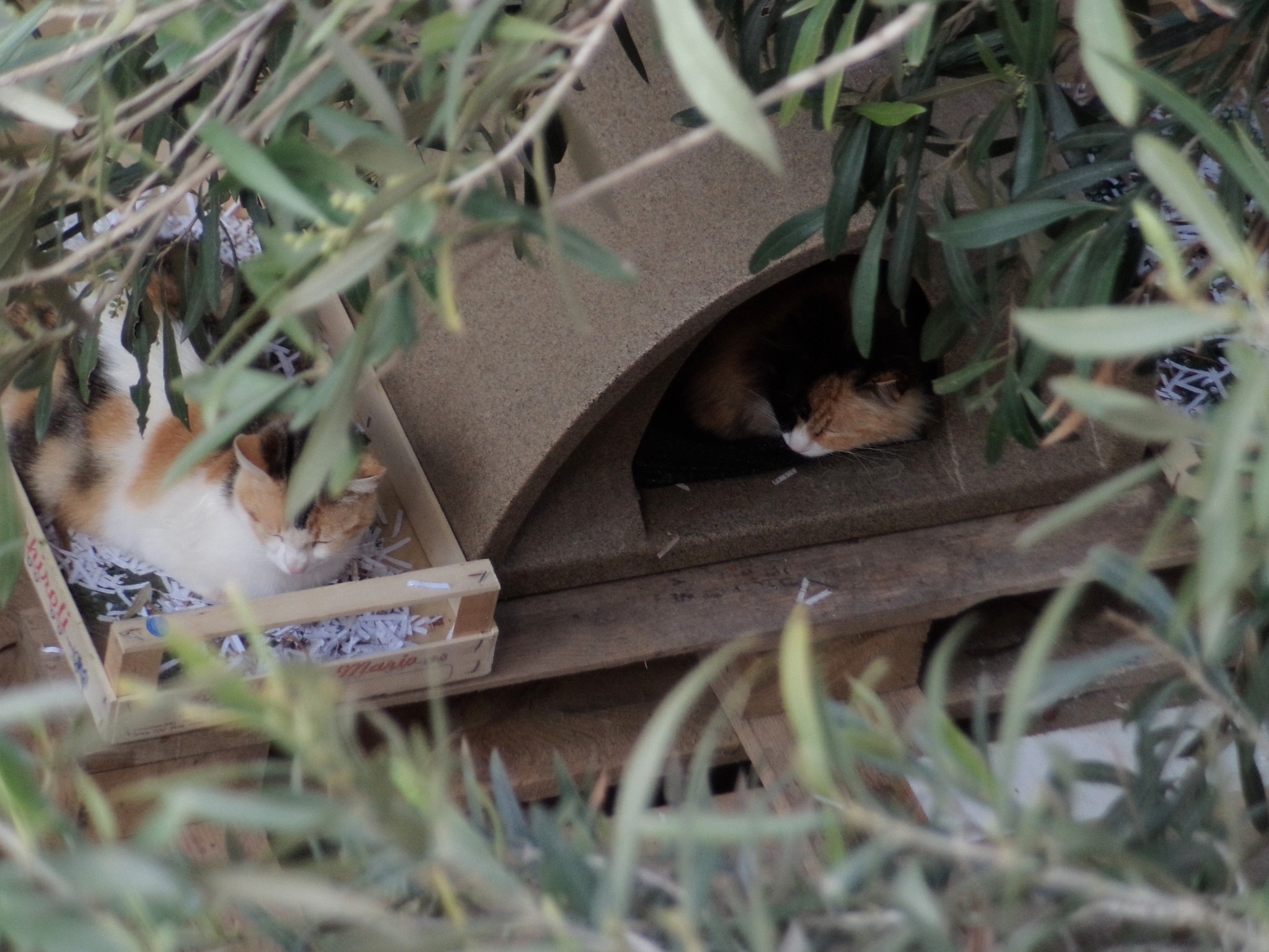 The Cat and Sprocket surprised us by combining their kittens (born within a few days of each other) into a single colony that spring, nursing and mothering them together. The first two weeks of the kittens’ lives were spent in the garden. Then Sprocket carried the kittens to the first floor terrace where there was a pile of recently-pruned olive branches. The Cat installed herself under the branches at the very back, and, apart from coming out for food and water, remained hidden for a full week, nursing the runts of their litters. Sprocket supervised the stronger kittens’ first wobbly steps and forays into the daylight and, once all the kittens were strong enough to leave the den, The Cat emerged.