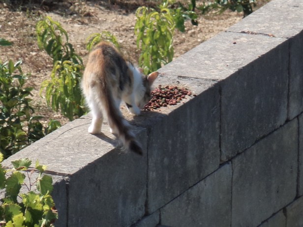 After that, Visitor ate on top of the wall and relaxed on a plant ledge – so long as her paws did not touch the ground, The Cat was mollified.