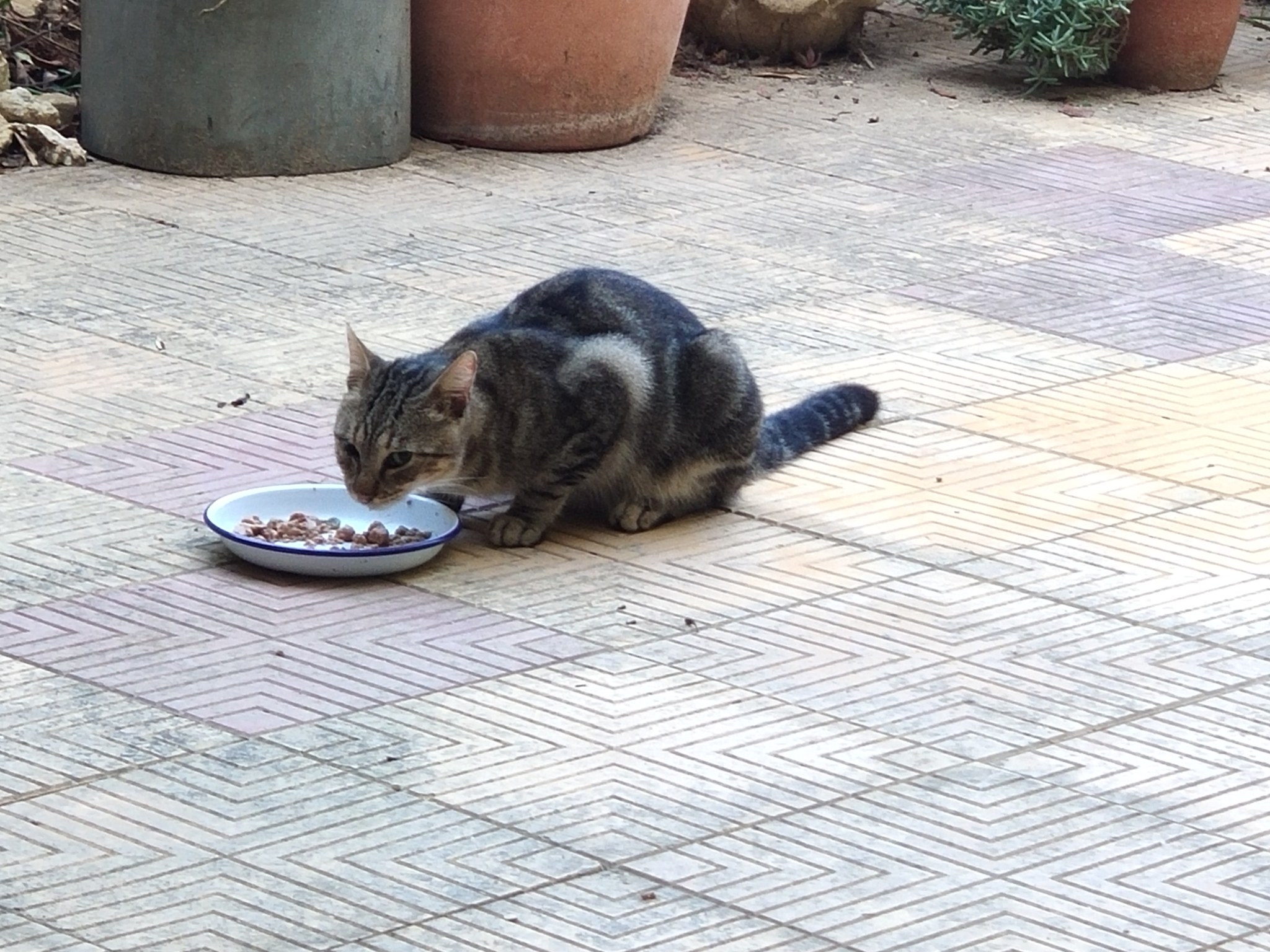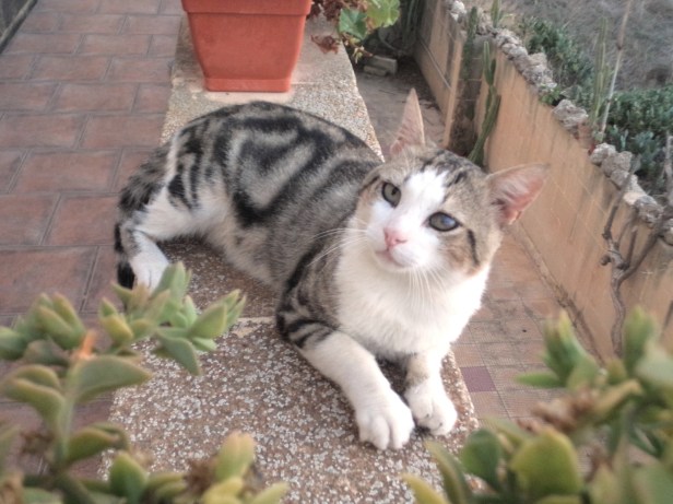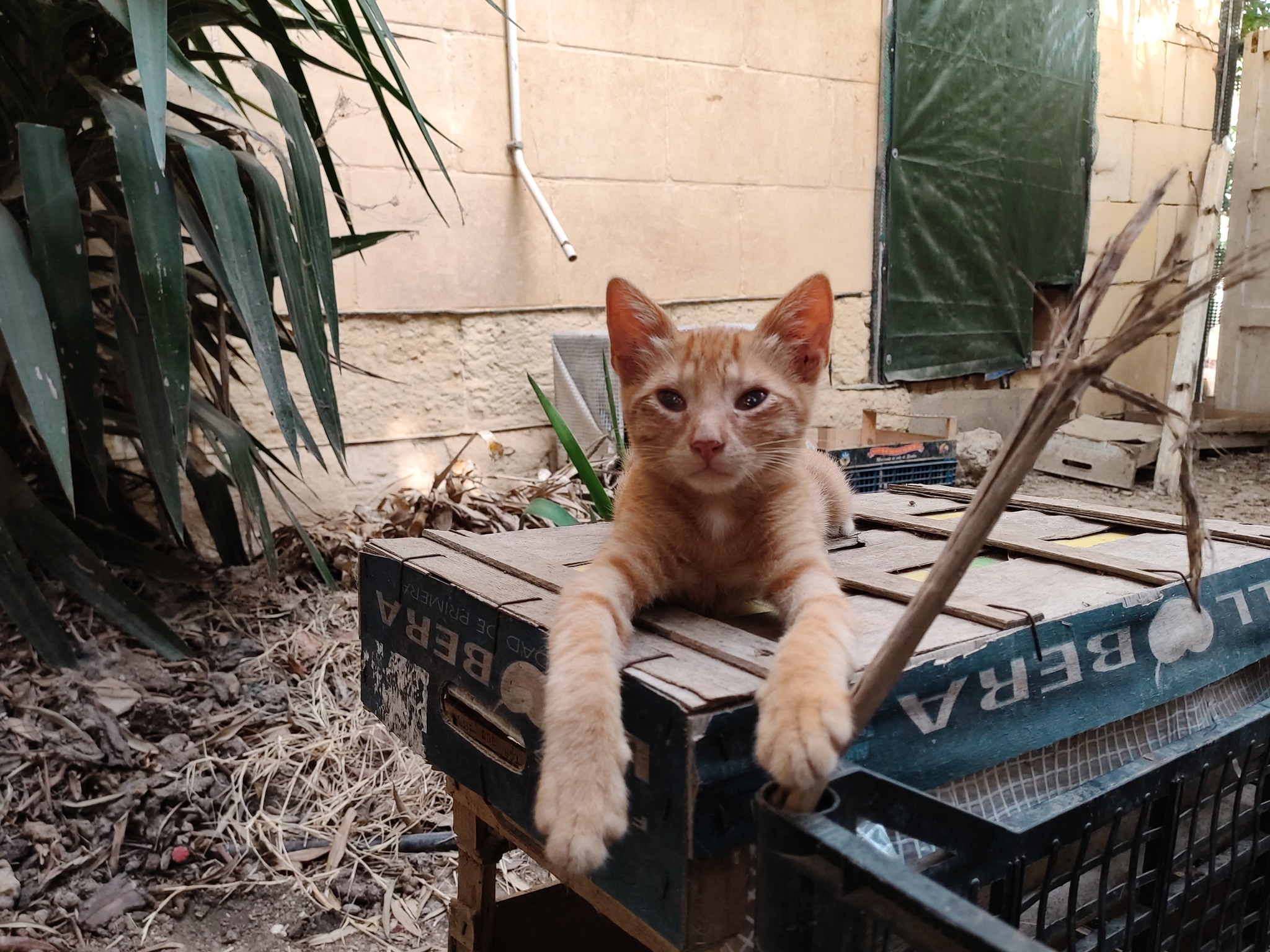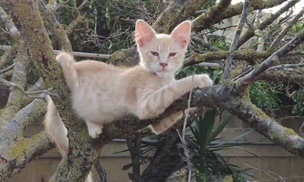 When Dawn brought her kittens to the garden for weaning they were already very unwell and, having been born and raised in the fields, were not used to humans, which made it more challenging to treat them. Her son Cetti’s sight was never going to be perfect, but he managed well and was as adventurous as any of the other kittens. As he grew bigger, it became more difficult to catch him twice a day for his eye-cleaning and eyedrops routine as he quickly learnt that the high wall at the top of the olive tree was a safe place and somewhere that the humans would not be following him.