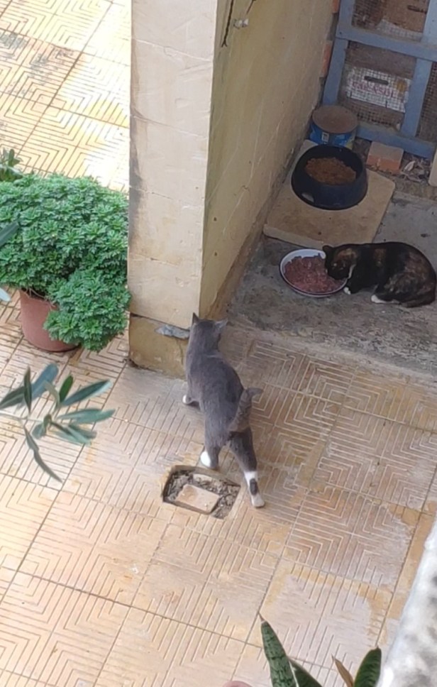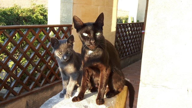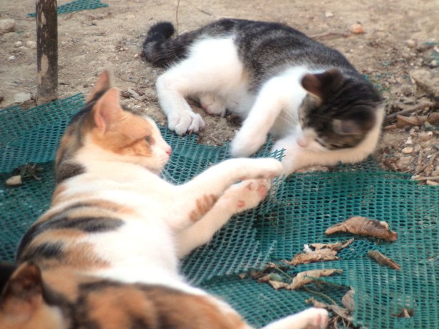 Twilight brought her kittens up in the fields. She was an excellent mother and had no problem in bringing five kittens across all the fields to the drive to eat, keeping them together until they reached their destination. Even when the kittens had grown up, they remained close and loyal to their mother, and often accompanied her in a protective role when she came to eat, as her son Syllabub is doing in this picture. Not long afterwards, Syllabub attached himself to Phantom and her family, and his protective role moved away from his mother to his first adult mate.