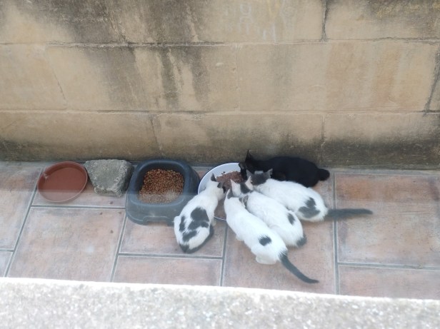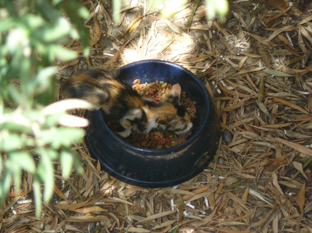 Phantom’s kittens were always superbly disciplined. She brought them (all together) from the far side of the fields on the other side of the road to the front path where they gathered obediently around the bowl, sharing nicely, with no arguing.
