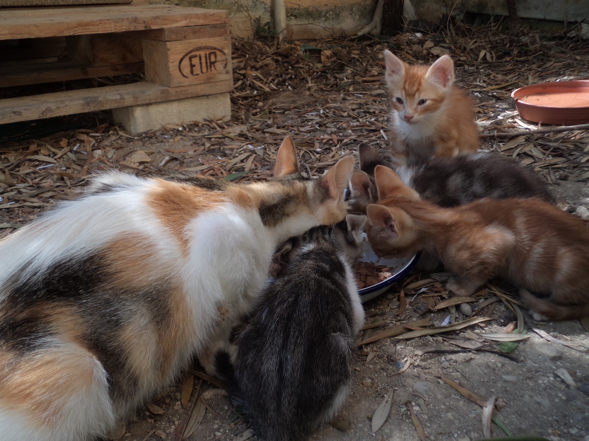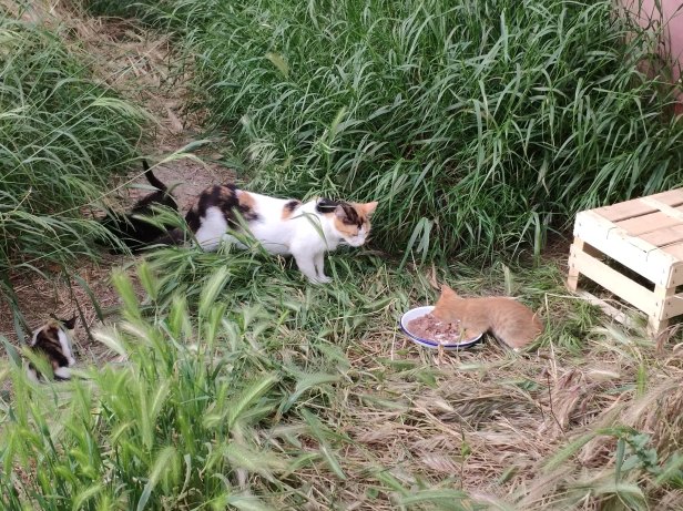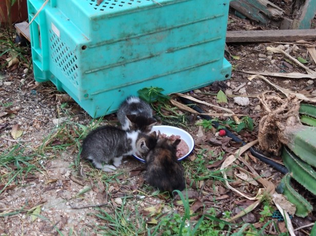 Cracker brought her kittens to the garden from the fields and made a nest for them behind an old ladder and these crates. Clover, Dandelion and Daisy were not used to all the other cats who ate in the garden, so it was better for them to have their own bowl next to their nest in familiar surroundings for their first week or so.