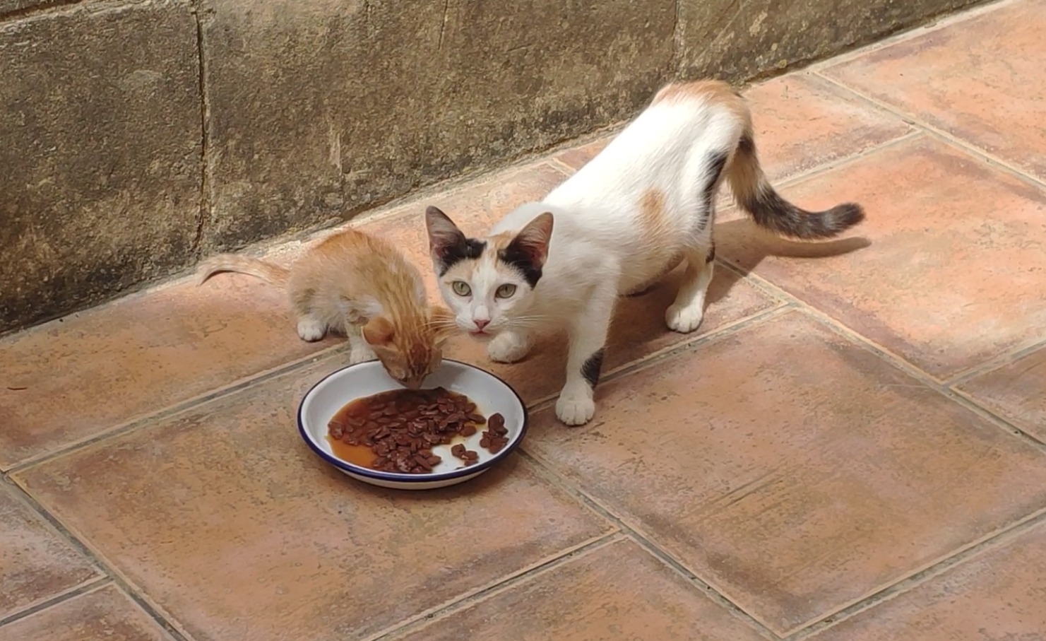 Flora and some of her kittens at teatime. As you might expect, the brown bowl of munchie-crunchies with jelly pouch mixed in (which was Flora’s favourite) was intended for Flora. In true cat fashion, however, the kittens insisted on eating it while their mother tucked in to the dish of wet food intended for them.