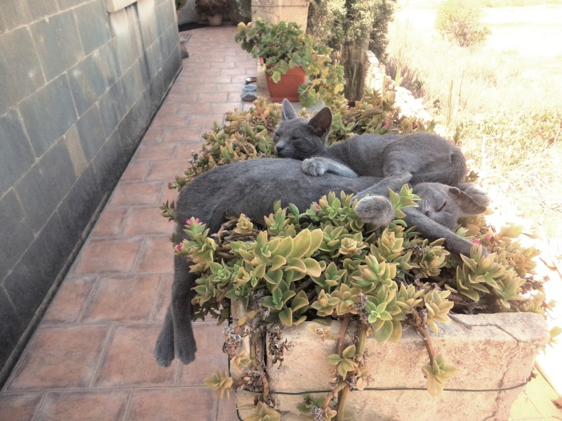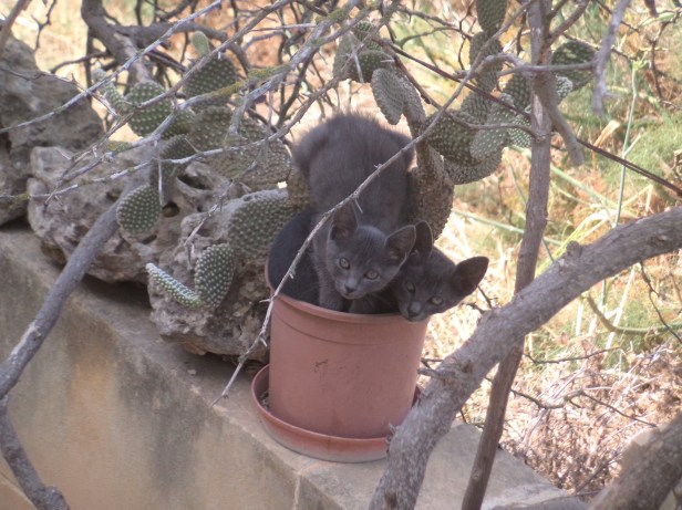Kiwi had hoped to give birth to her kittens in the garden which would have made life for her, as a CH cat, much easier. But, for some reason, The Cat disliked Kiwi intensely and chased her out of the garden when Kiwi went into labour, so Kiwi gave birth to her kittens up the road, under a prickly pear bush in the fields. Walking to the drive and front path for food and water a minimum of twice daily was hard work for Kiwi and, by the time she decided that the time was right for weaning, she was exhausted.