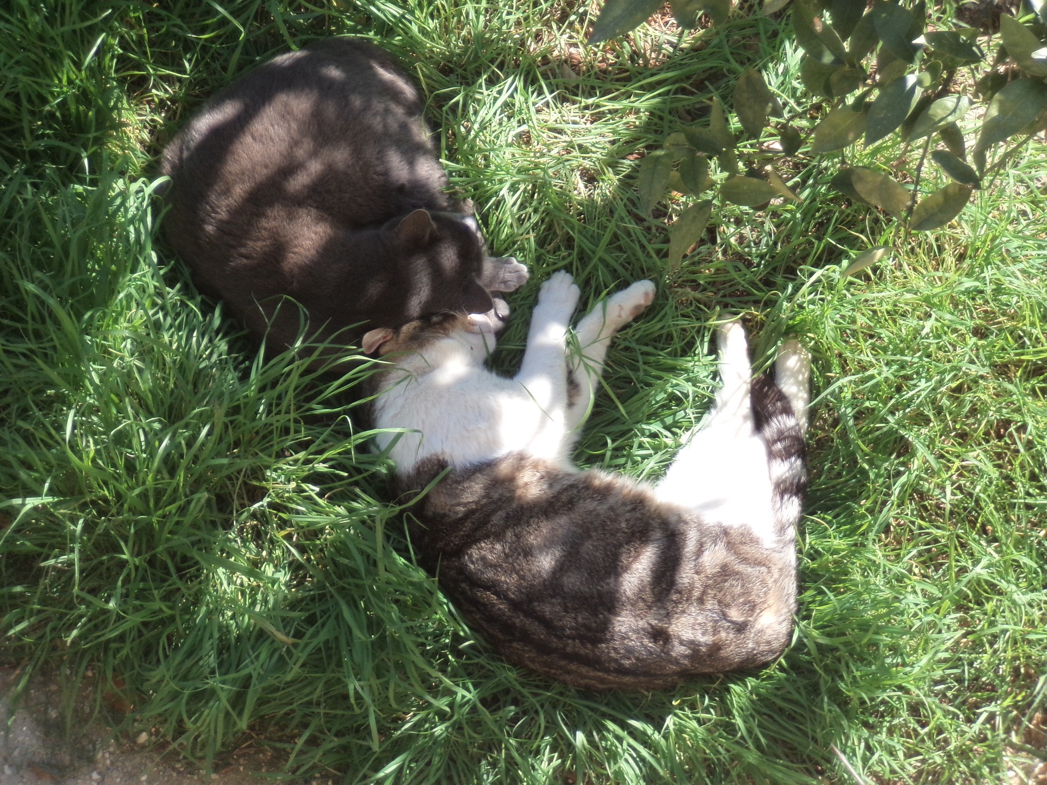 Kiwi was black with two little white patches – one under her chin, the other a bikini patch – and the kittens were grey with similar white spots. We named the boy Stardust and his sister, Ariel. The family spent some of their time in the front path and the drive, the kittens playing, clambering through the plant troughs, and sleeping in the plants.