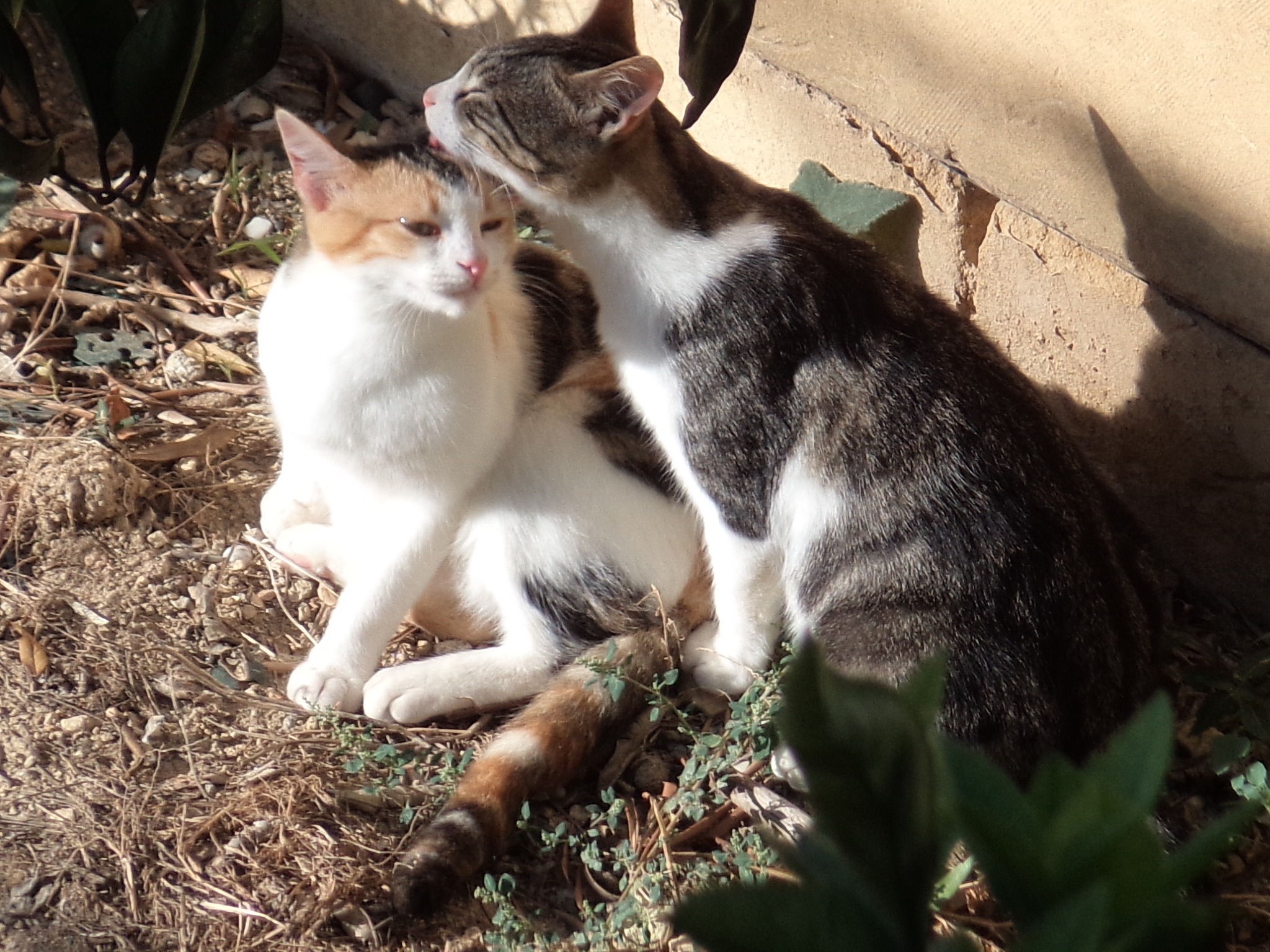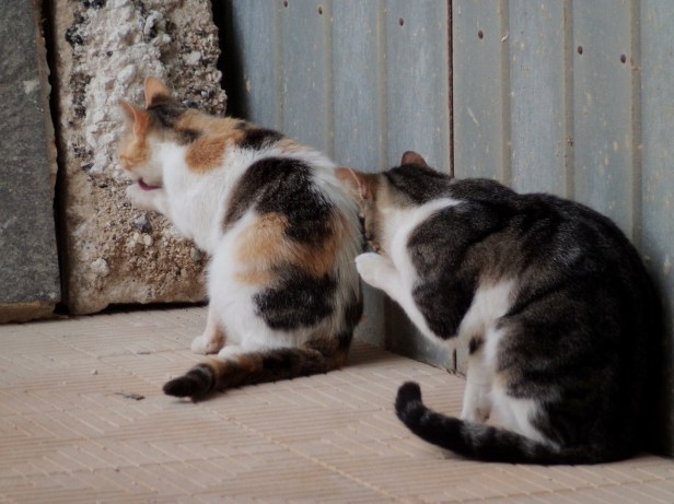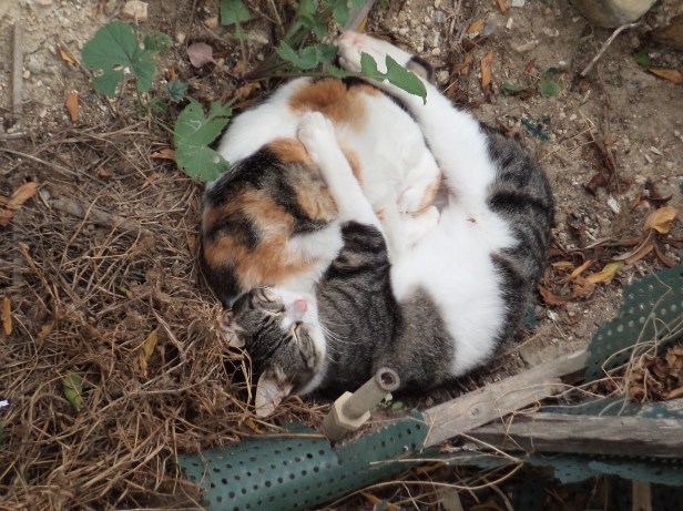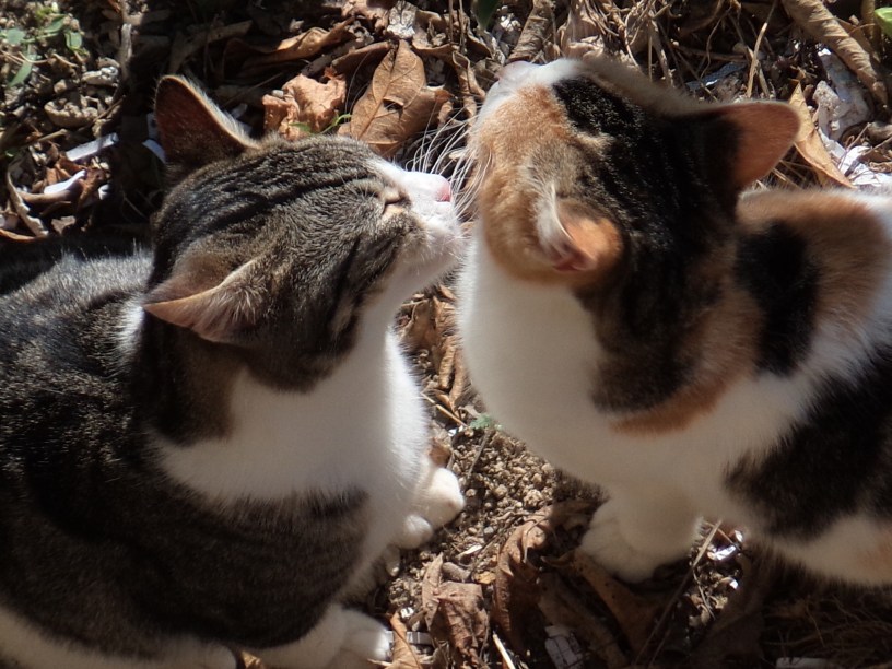 As they grew into adolescent felines, their play sessions were replaced by mutual grooming (allogrooming) sessions – something that continued into adulthood. There was no dominant figure in this activity, and they both groomed each other equally. Sprocket and The Cat continued to enjoy allogrooming the following year, when they were raising their families together in The Cat’s Garden.