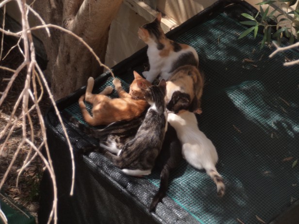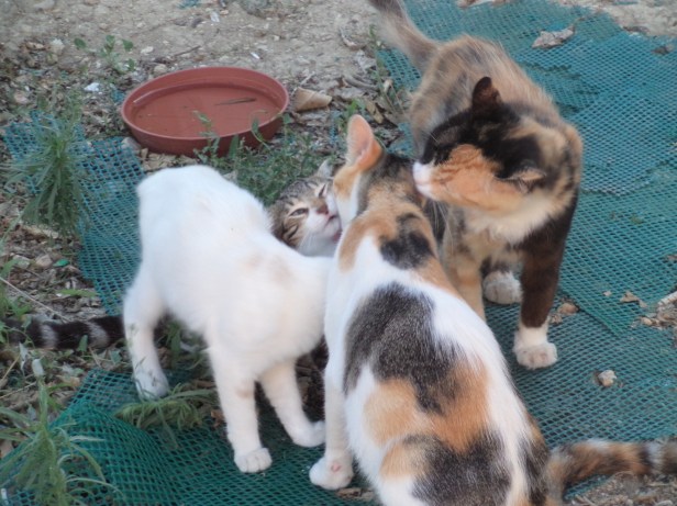 When The Cat and Sprocket later joined forces in the garden and brought up their litters in a single colony, the different aspects of mothering were shared between them. They both groomed the kittens – not only their own birth kittens, but any of the colony kittens. It was hard to know whether the kittens knew which mother was actually theirs, although it’s likely that the mothers knew which kittens belong to which female.