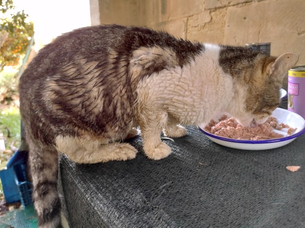 G5 was another cat who did not mind the rain. He also had a liking for wet kibble and would always be the first cat to arrive after shower, heading straight for the softened food.
