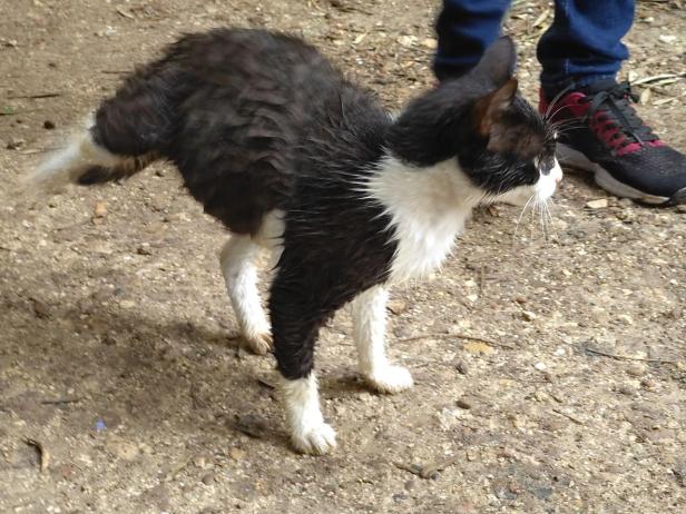 And finally Phantom (a petite feral cat from the fields opposite) would arrive at mealtimes, saturated from walking through the fields after a night’s rain. Like Greyfur, the top layer of her fur formed spiky tufts, protecting the dry layer beneath.