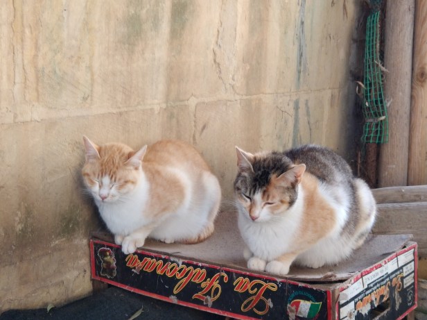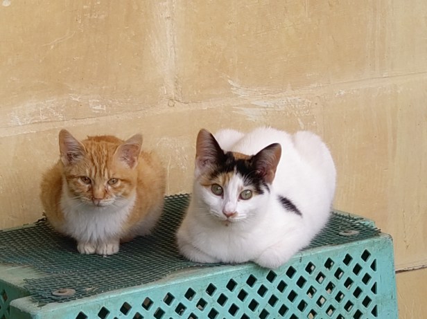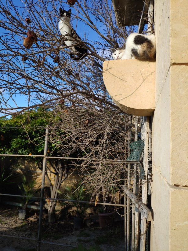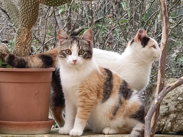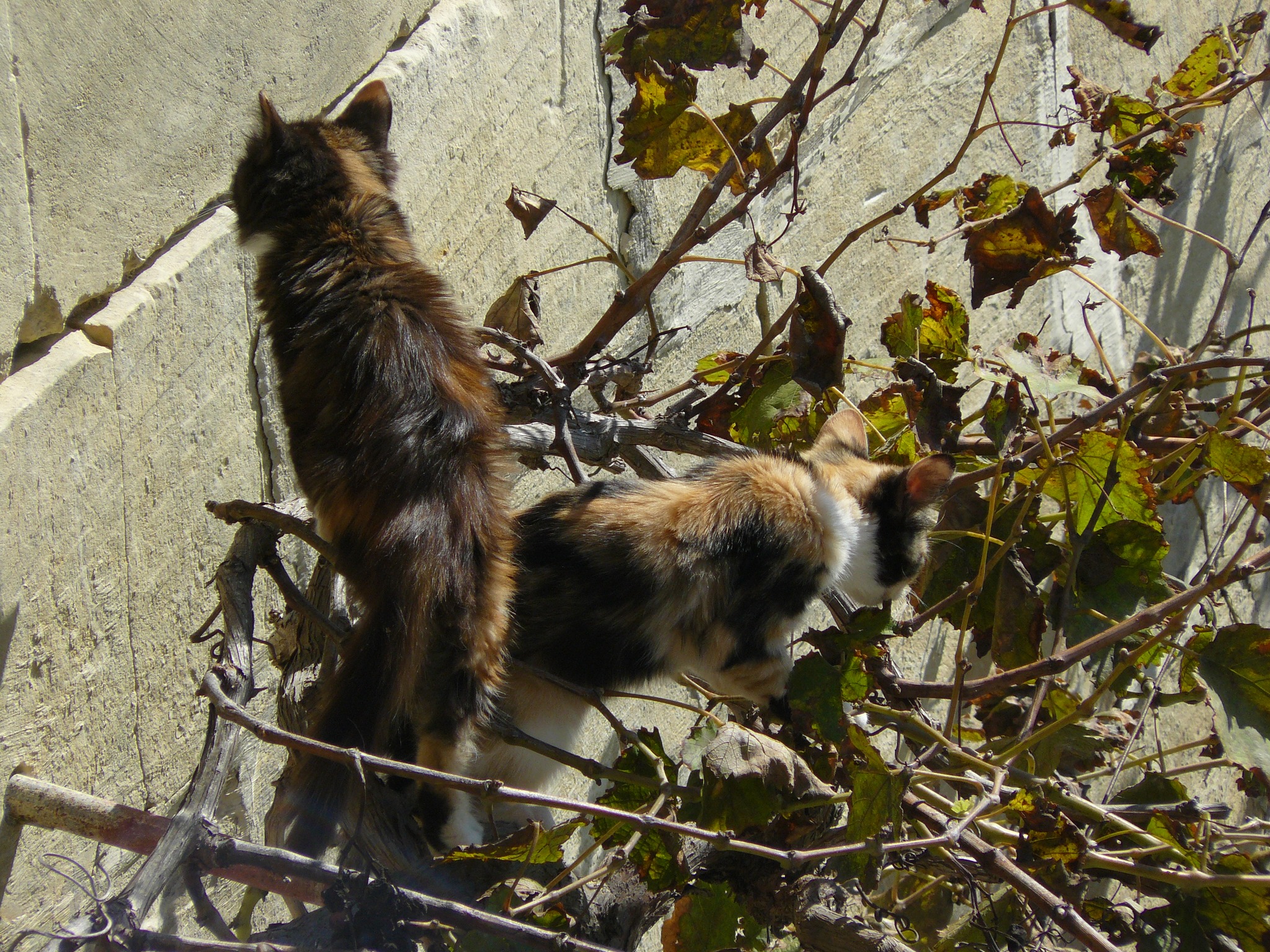 The Cat’s daughters, Fleckle and Drip. They were born in the fields and came to the garden for weaning. In this photo, Fleckle and Drip were exploring the vine which would lead them onto the garden wall from where they could look out over the surrounding fields.