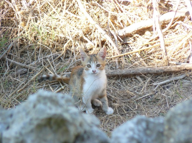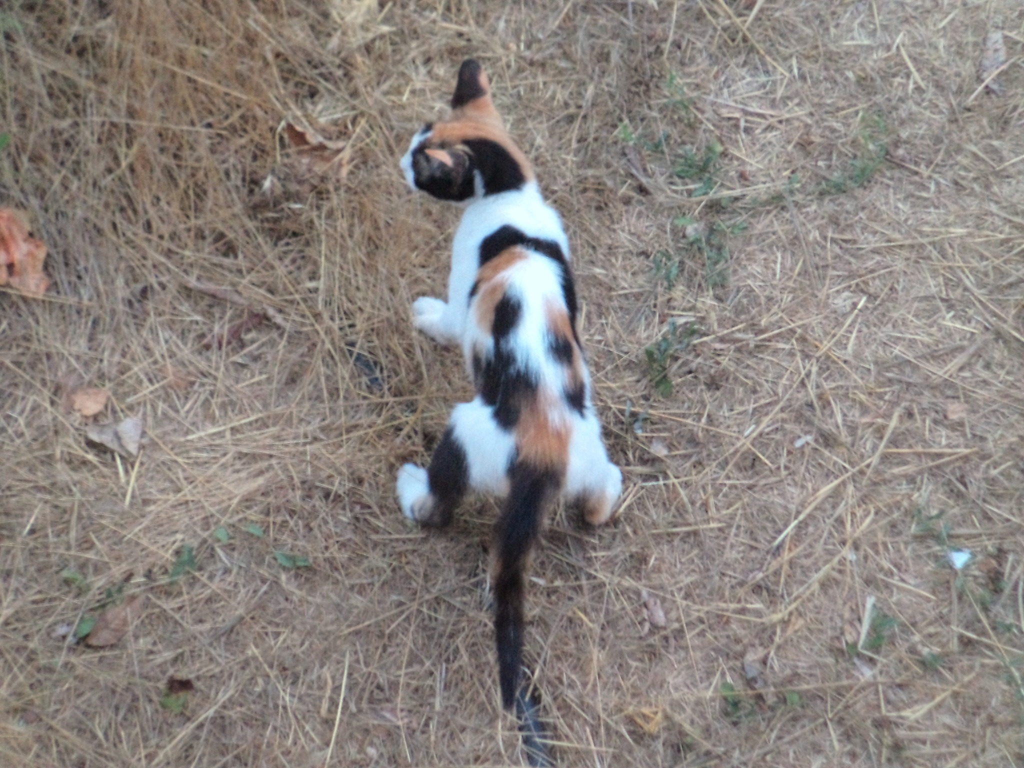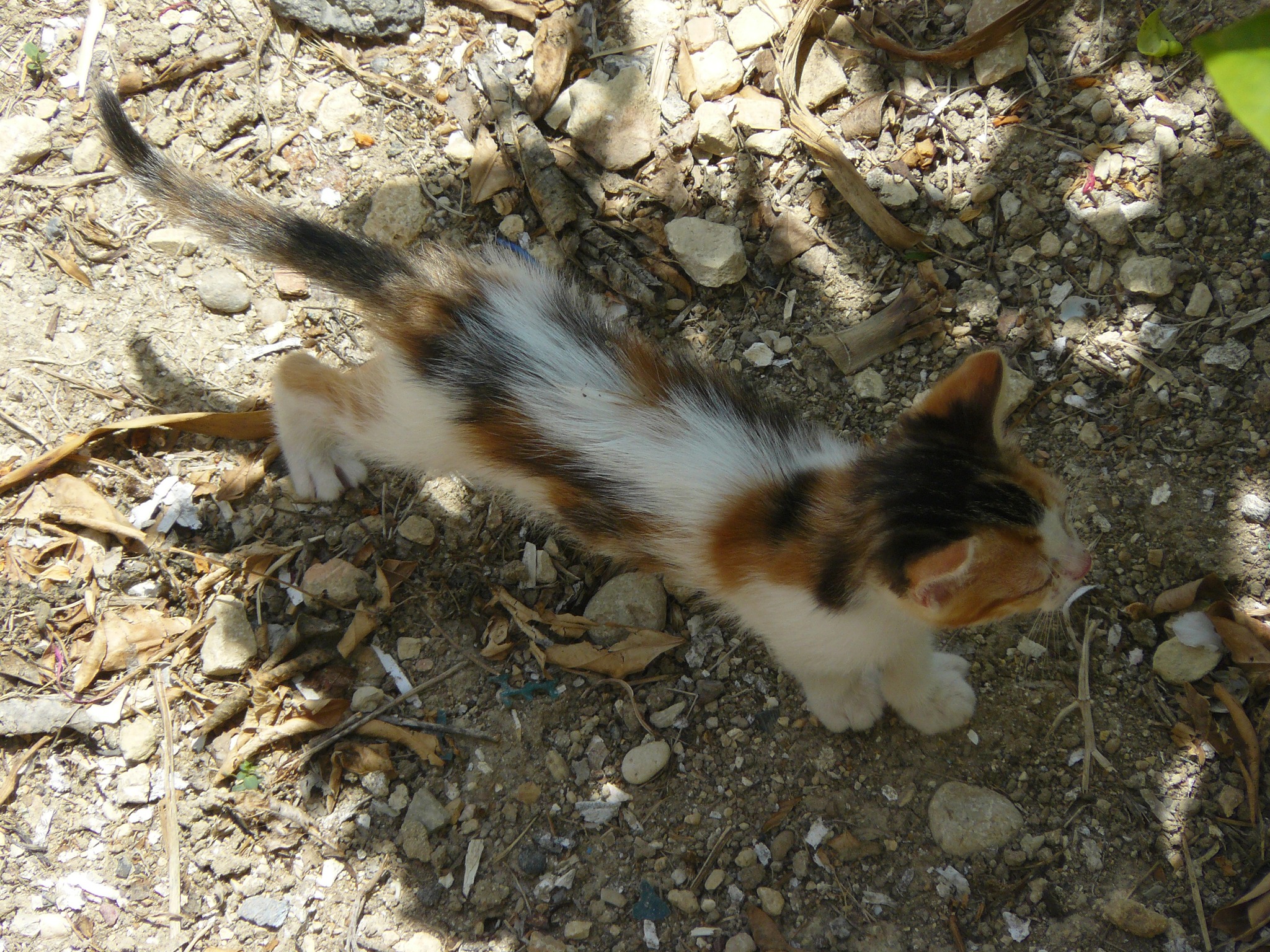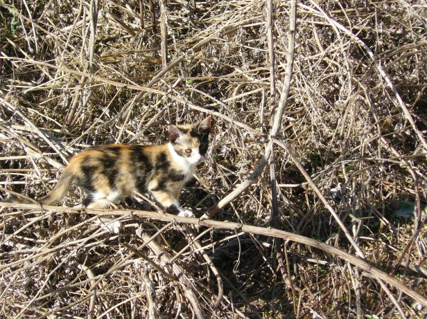 The first calico kitten we saw was Splodge. The colours and patterns of colours on her face were very like The Cat’s including the black eye patch, but bodily she was predominantly white, with orange and black patches – definitely a calico cat rather than a tortoiseshell.