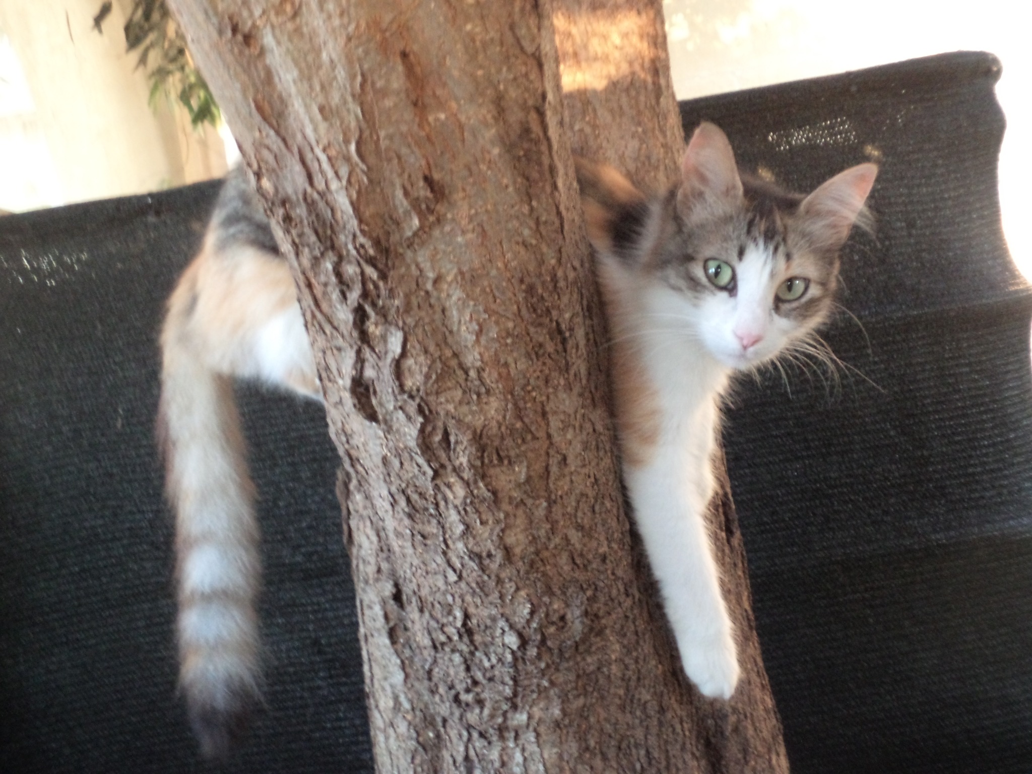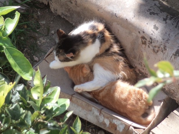 And then history repeated itself. Visitor once again had a family in the fields (this time we called them She-Girl 1, She-Girl 2 and He-Boy). Sadly it was He-Boy who lost his life, this time on the road, and Visitor found herself once again at the mercy of The Cat who allowed her to bring the girls (now named She-ba and Fennel) into the garden where they lived on the verandah with Visitor, safely away from the road.