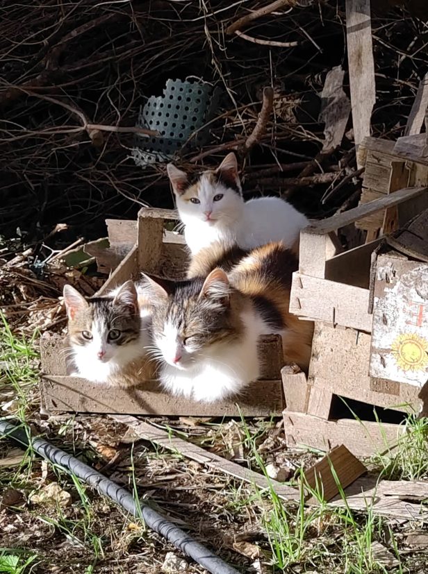 The girls were feral and not friendly, and when they were weaned, and they left the garden with Visitor and they returned together, to life in the fields.