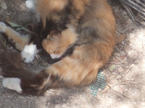 And then there was the surprise of the ‘accidental cure’. Greyfur had a painful abscess between his toes, so painful that he would not allow the humans to take a look. One day in the crowd of hungry cats at feeding time, I accidentally stood on his paw. He shrieked in pain. His foot was covered in blood as, quite by chance the abscess had burst. He immediately started to feel better, and with a follow-up course of antibiotics, recovered completely. Needless to say, I was hugely relieved (although still feeling very guilty and apologising repeatedly to poor Greyfur).