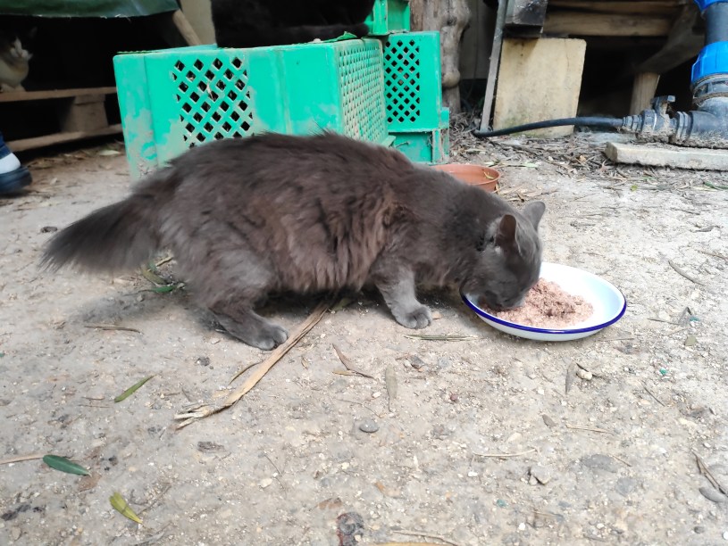 And, finally for today, Tumbleweed, who was the son of Storm (and grandson of Twilight). Tumbleweed was born and raised in the fields but came to the garden occasionally with his mother as a kitten, continuing to visit all through his adult life. He had a spectacular soft, fluffy grey coat and a stump for a tail. Storm herself was completely grey but with a short coat, so we assume that Tumbleweed’s coat must have come from his father, whoever he was.